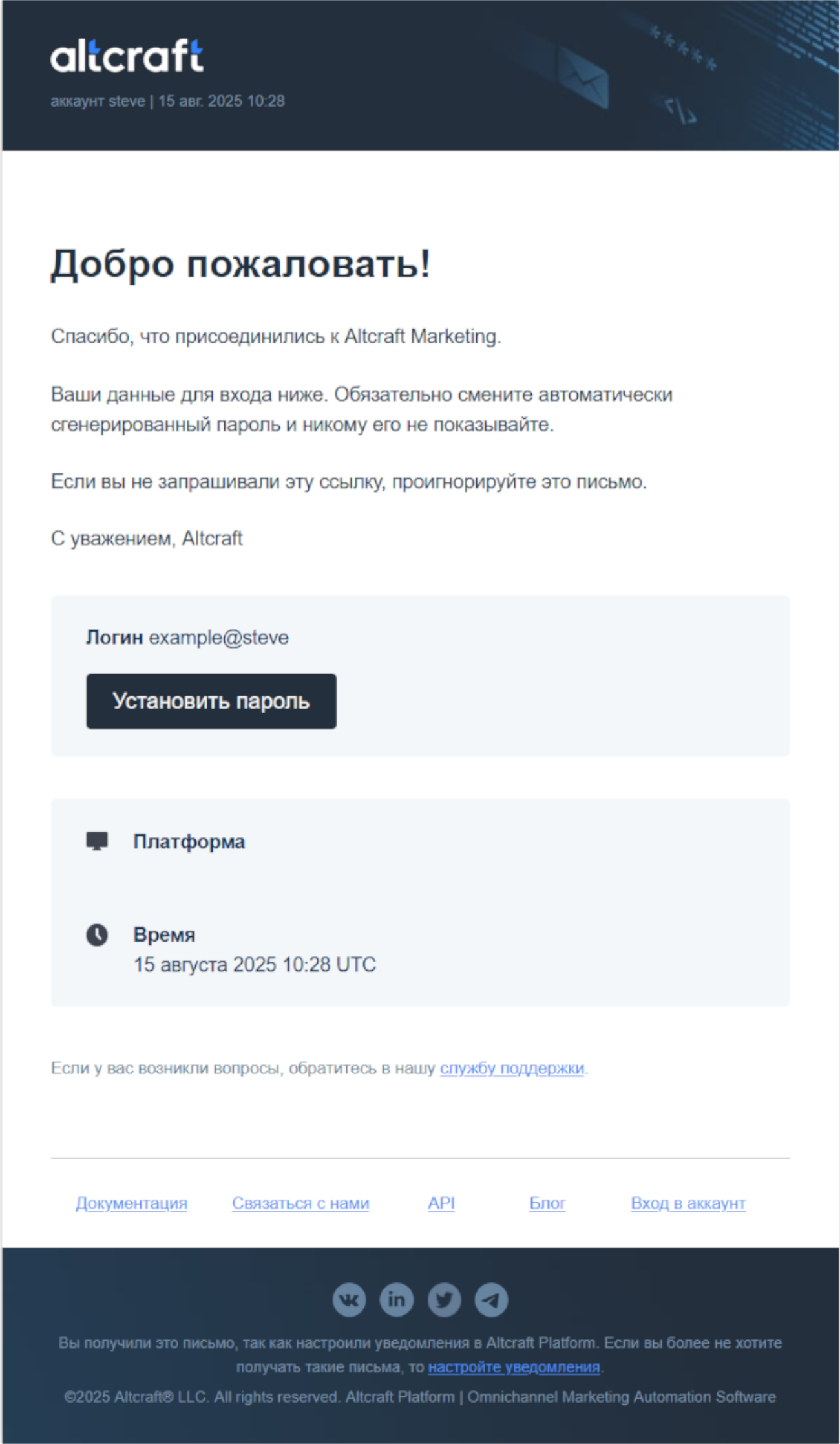 Sends a welcome email with a link to set a password. The email provides personal data about the initiator of the recovery/registration completion operation: