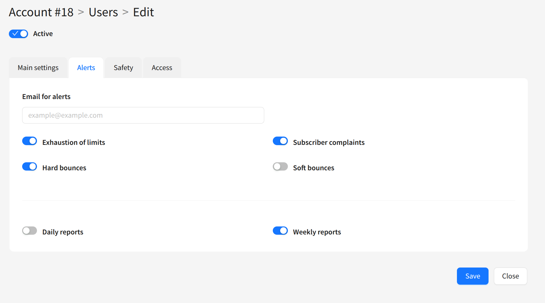 In the Alerts block, you can specify the user’s email for receiving Altcraft reports and notifications, and select which information the user will receive: