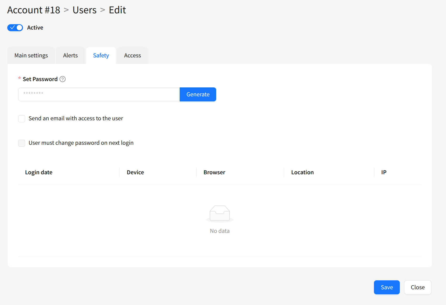 Send an email with access to the user — if enabled, an email with login details will be sent after saving.