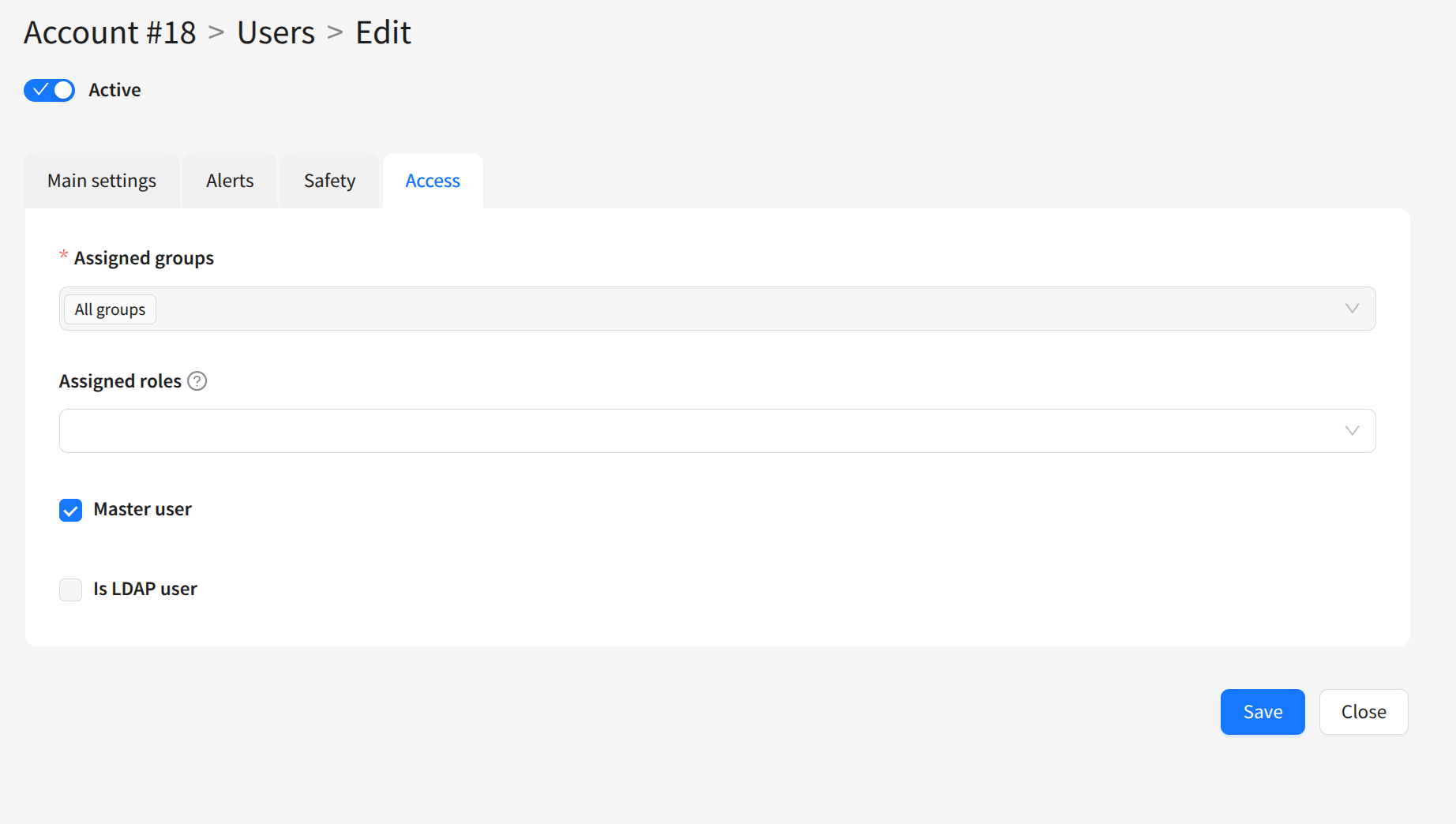 Assigned groups — grant the user access to Groups of account objects. Master users can create object groups when editing any account object.