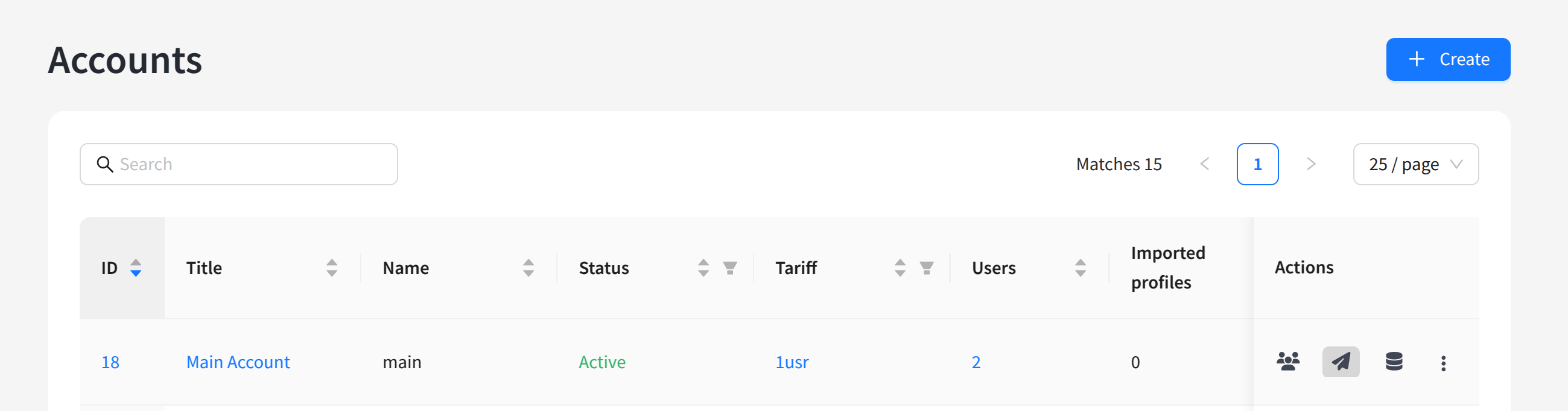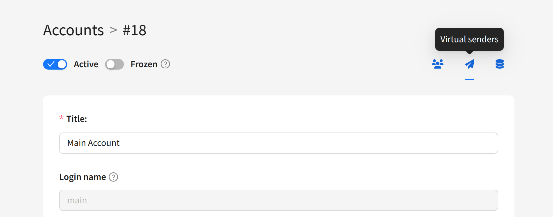 To manage virtual senders, in the list of accounts click the quick action button: