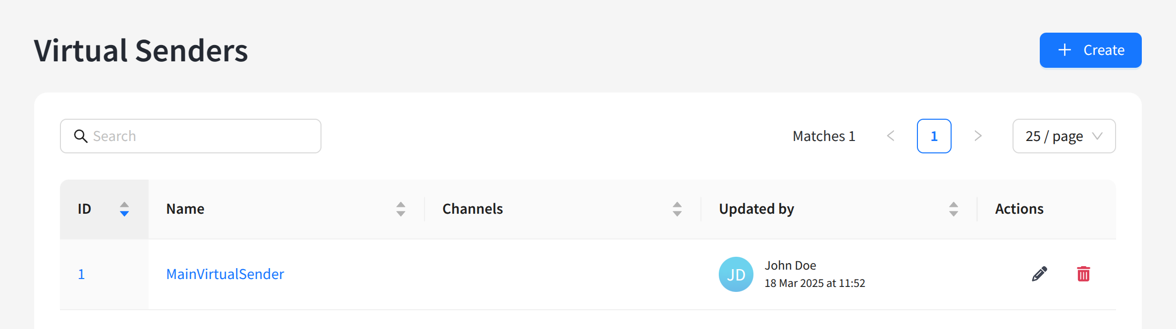 The list of existing virtual senders will open. On the right side of the table are the edit and delete buttons. You can also click the virtual sender identifier on the left to edit. To create a new virtual sender, click + Create: