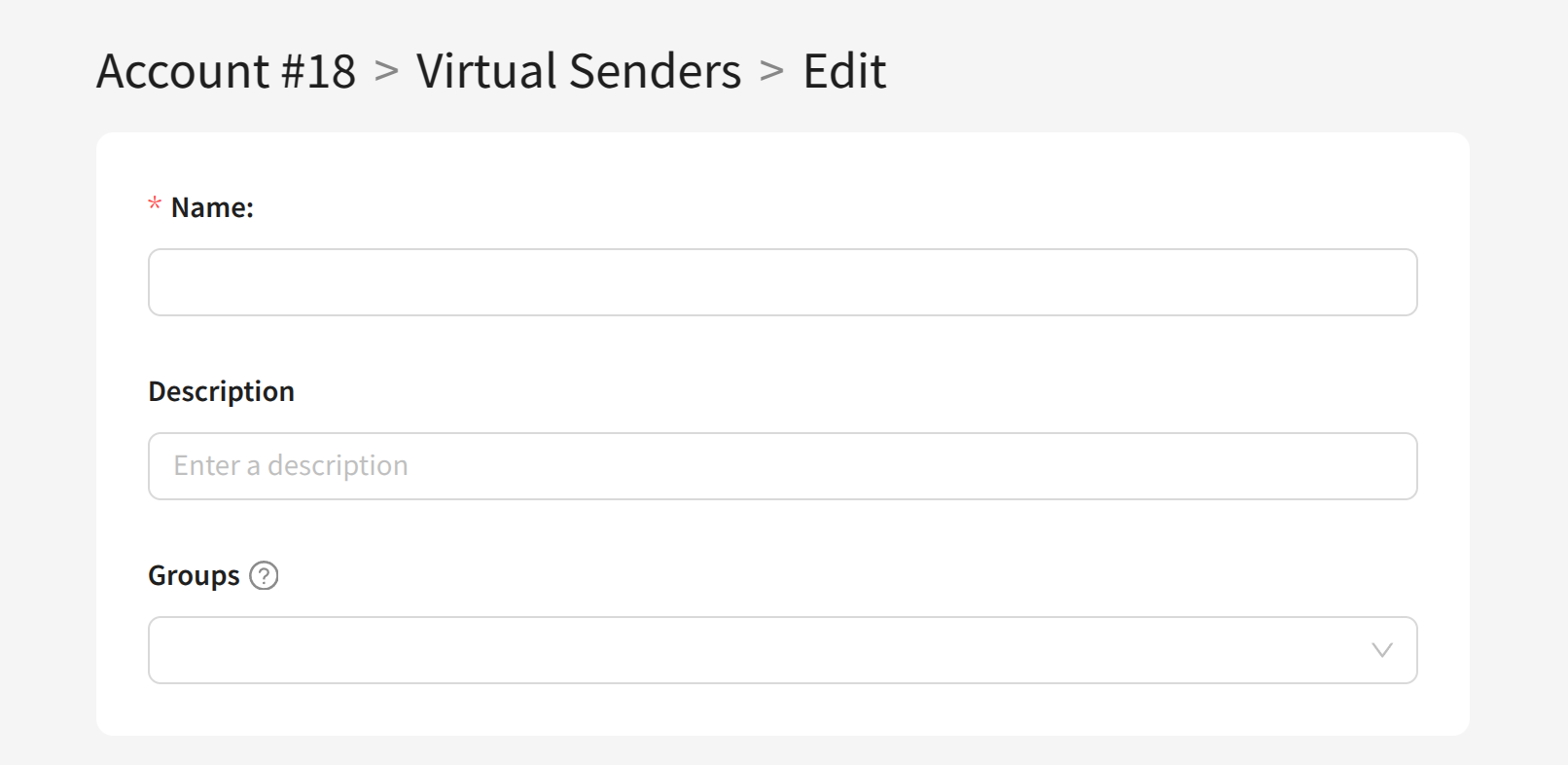 In the general settings, specify a unique Name for each virtual sender and assign the account object Groups where the virtual sender will be available (Groups):