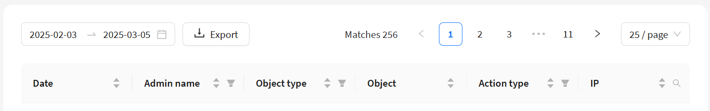 After selecting the desired audit parameters, click Apply to generate the report. To display information about all actions in the Administrative Panel, select All in the filters. You can download the report in CSV or XLS format by clicking Export.