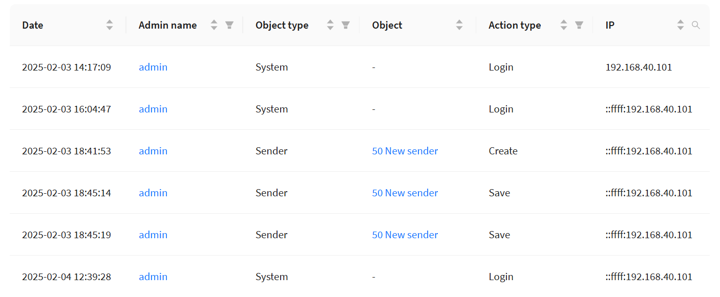 Administrator actions can be filtered by several parameters. From left to right, top to bottom: