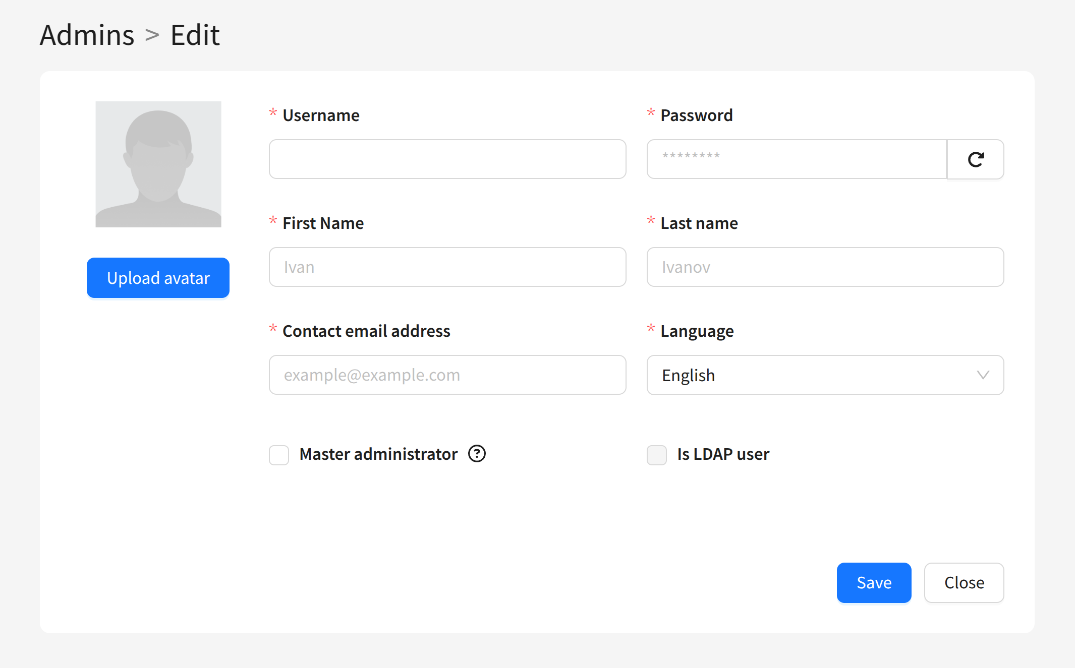 - Language — Admin Panel interface language.