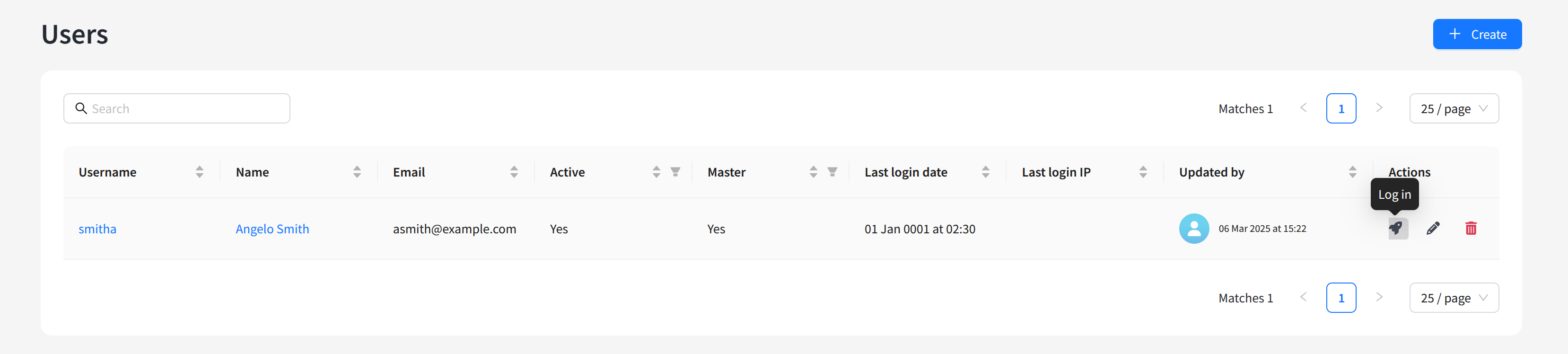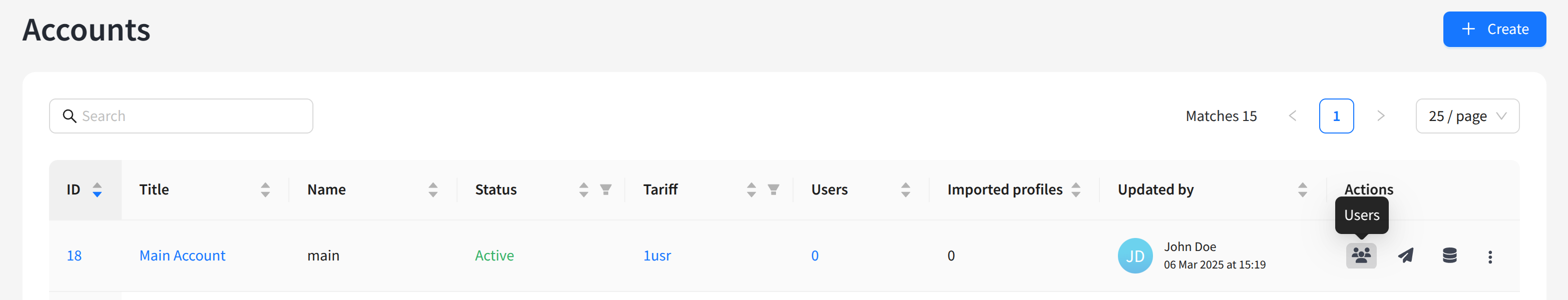 The opened list displays existing administrator accounts. On the right side of the table, there are edit and delete buttons. You can also edit by clicking the identifier or name of the administrator account (on the left). To create a new account, click + Create: