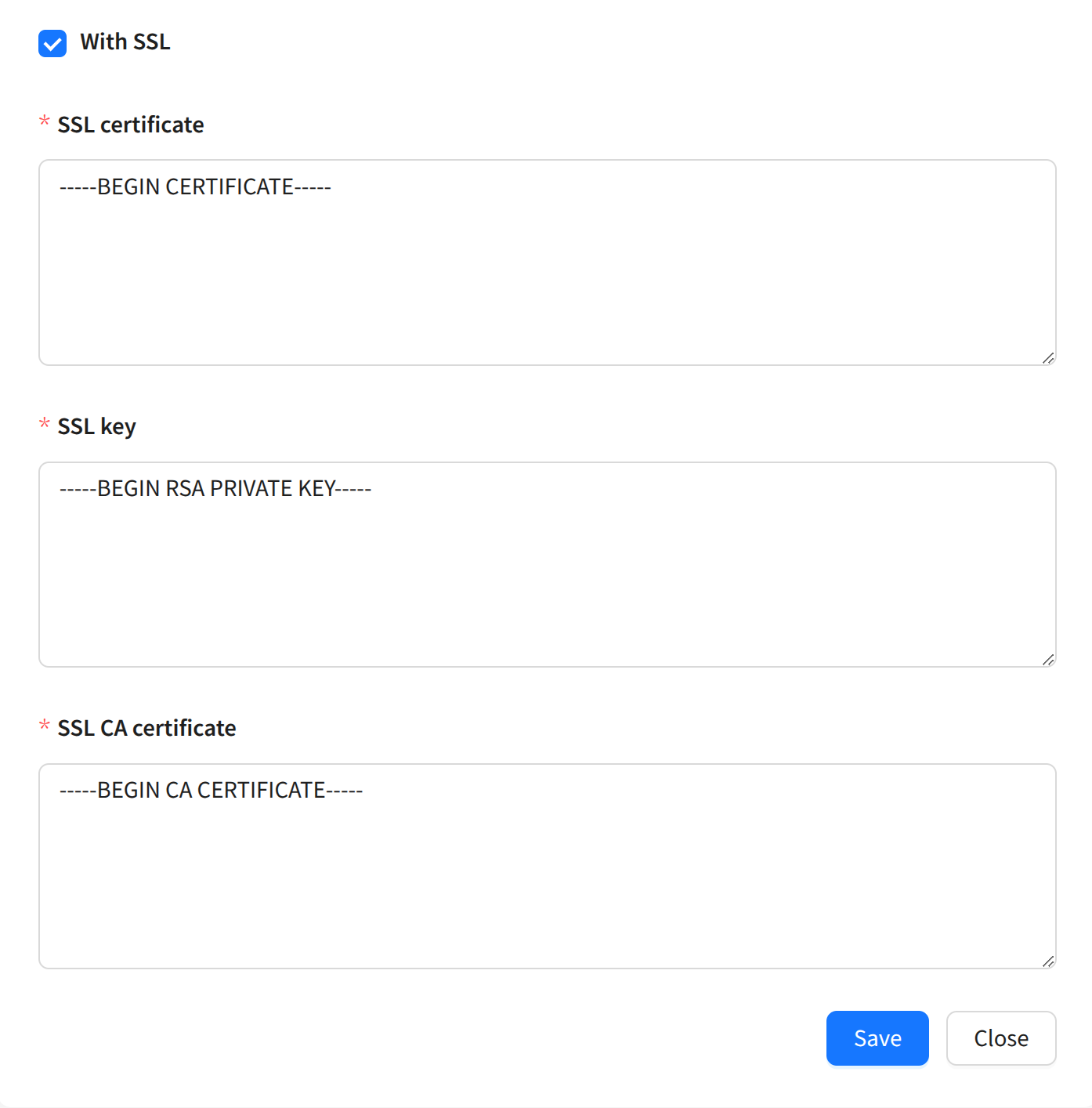 For ClickHouse databases, you can enable SSL support. To do this, activate the Via SSL connection parameter and fill in the necessary fields: