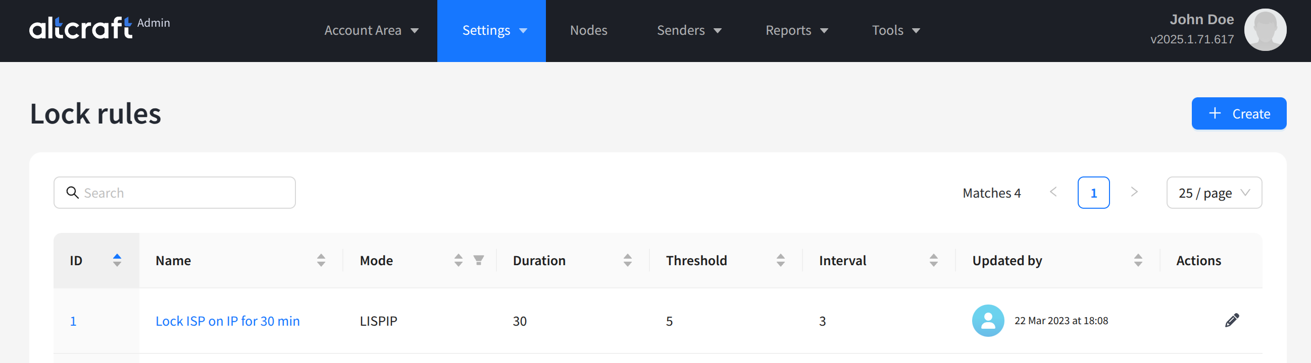 The opened list displays existing AKMTA lock rules. On the right side of the table are the edit and delete buttons. You can also edit a rule by clicking the identifier or name on the left. To create a new rule, click + Create.