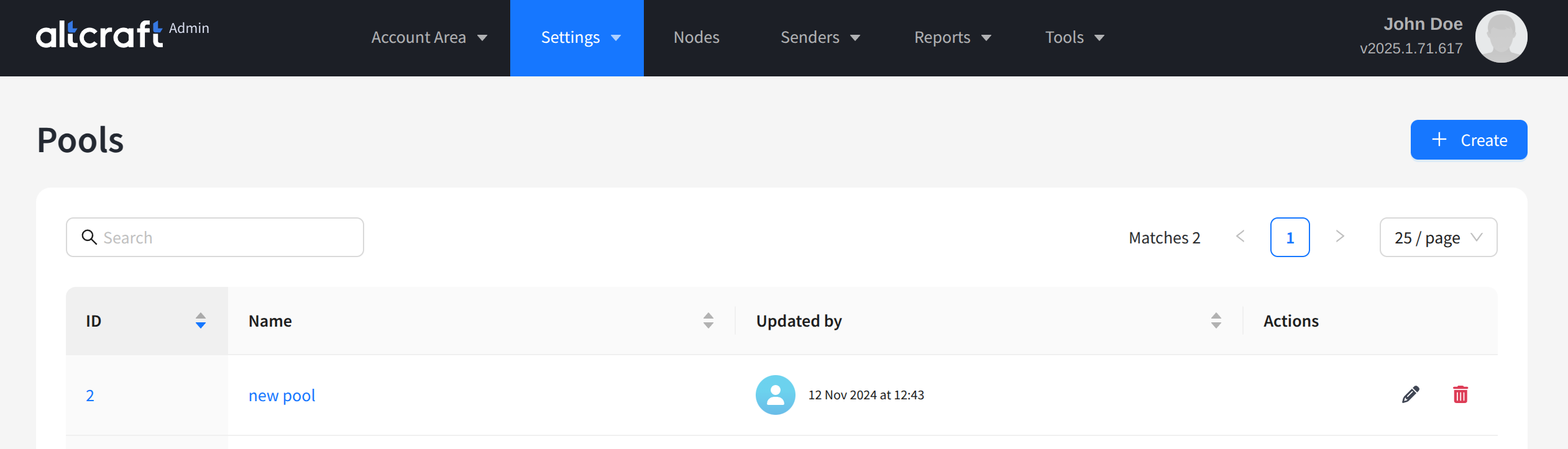 The opened list displays existing pools. On the right side of the table are the edit and delete buttons. You can also open editing by clicking the pool identifier or its name on the left. To create a new pool, click + Create: