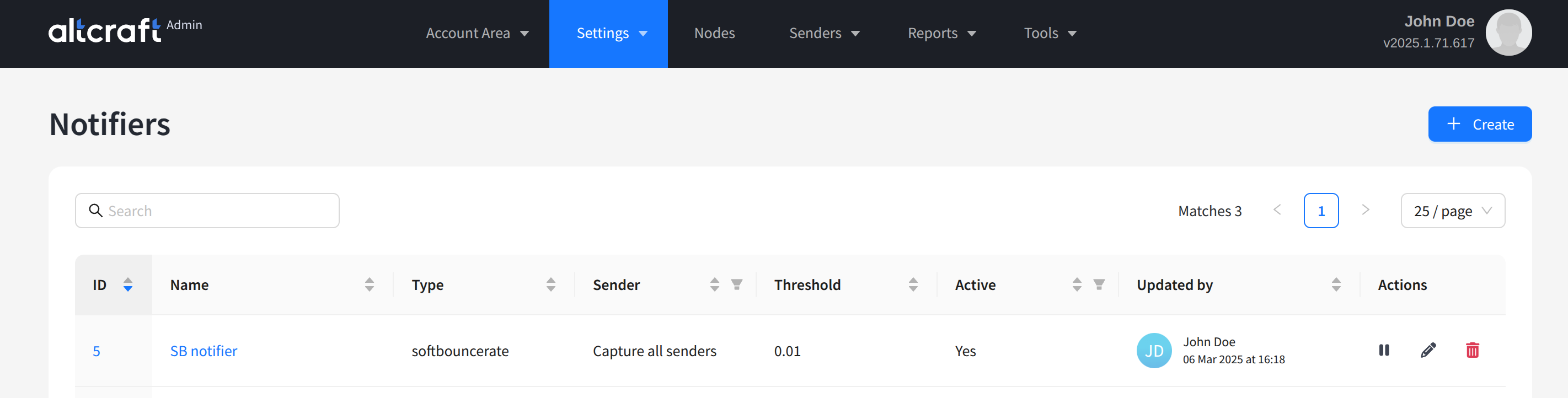 The opened list displays existing notification settings. On the right side of the table are the edit and delete buttons, as well as the activation/deactivation button. You can also edit an object by clicking its identifier or name on the left. To create a new object, click + Create: