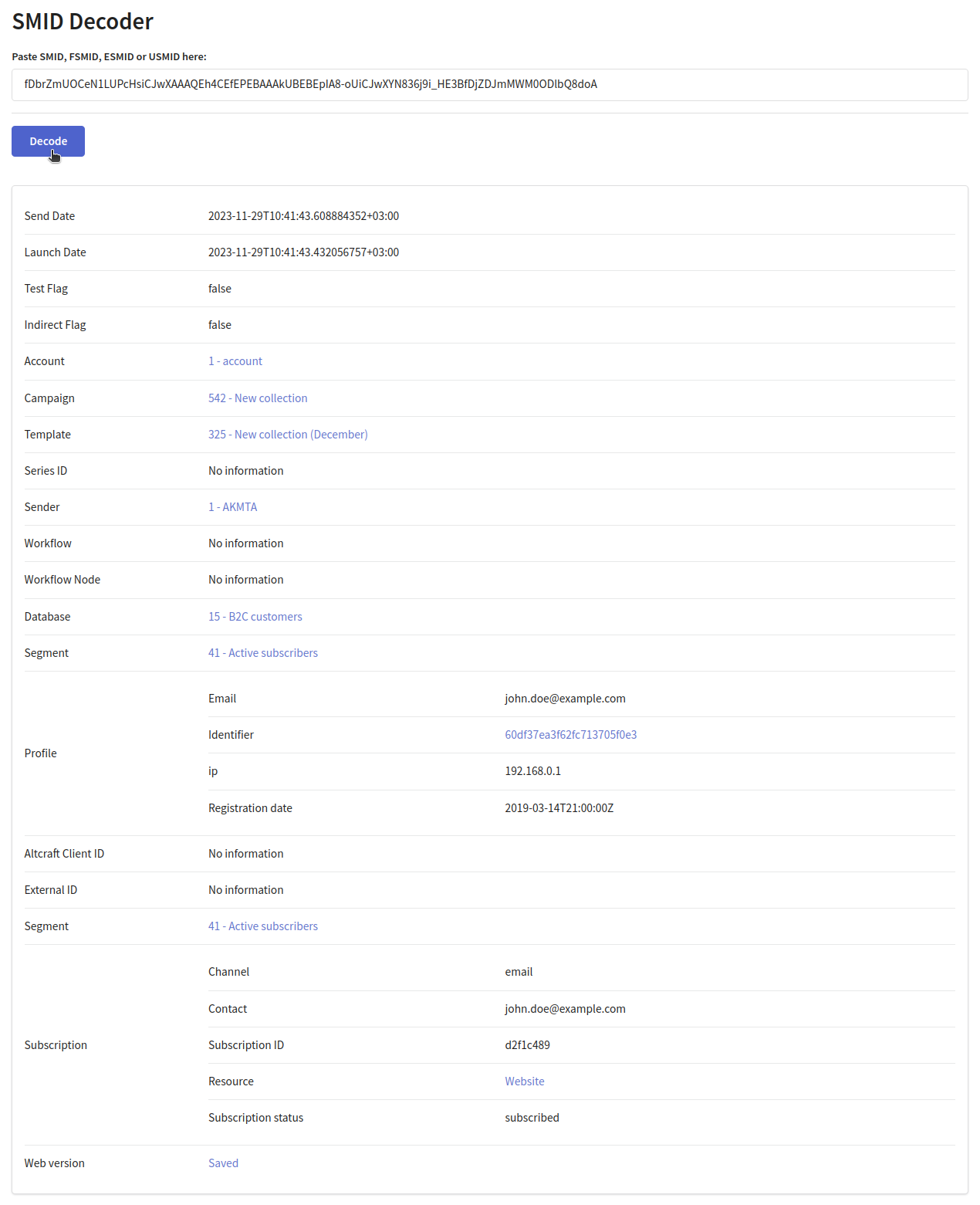 Paste the message ID (SMID, FSMID, ESMID или USMID) and click Decode. Depending on the identifier type, the result contains detailed information about platform objects used to generate this message:
