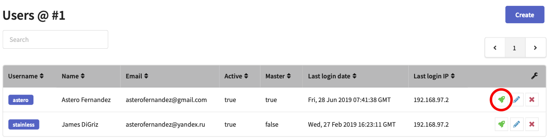 You can log into an account directly from the Altcraft Admin Panel. To do this, pop-ups must be allowed in your web browser. Go to the list of account users and click the rocket button next to the desired user: