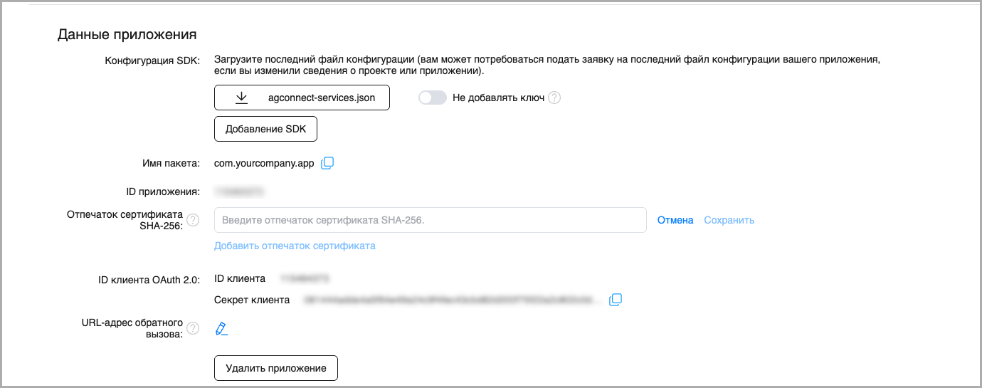 Scroll down to the Huawei settings and specify the App ID, OAuth 2.0 client ID, and OAuth 2.0 client secret: