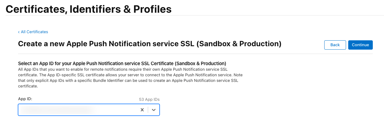 In Services, select Apple Push Notification service SSL (Sandbox) or (Sandbox and Production) depending on the environment. Then choose your app from the list: