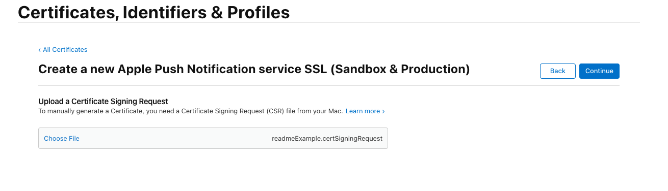 Upload the previously created Certificate Signing Request (.certSigningRequest file):