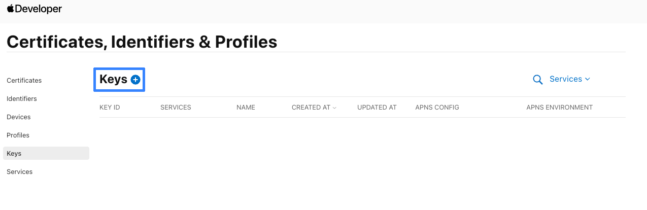 Go to the Apple Developer website, section Account. Navigate to Certificates, Identifiers & Profiles — Keys. Create a new Key: