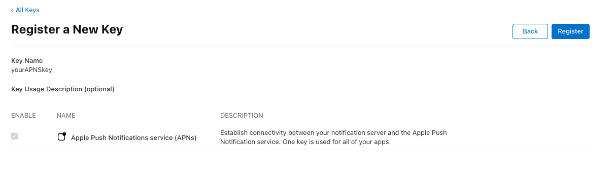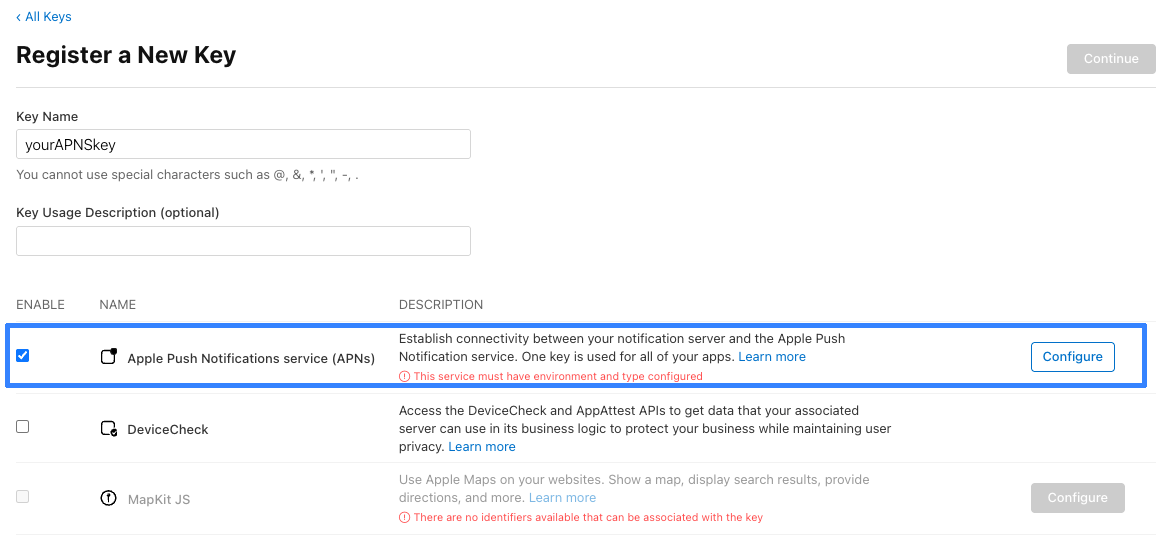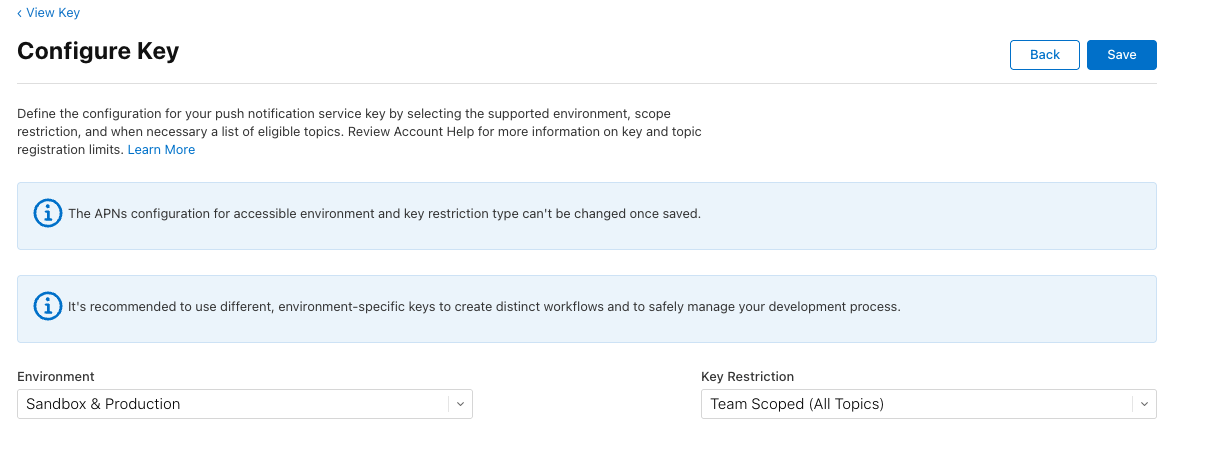 You can configure APNS using either an authorization key or a certificate. The setup method depends on the selected option.