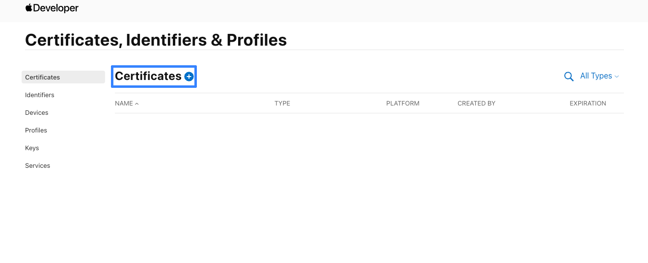 Go to the Apple Developer website, section Account. Navigate to Certificates, Identifiers & Profiles — Certificates and create a new certificate: