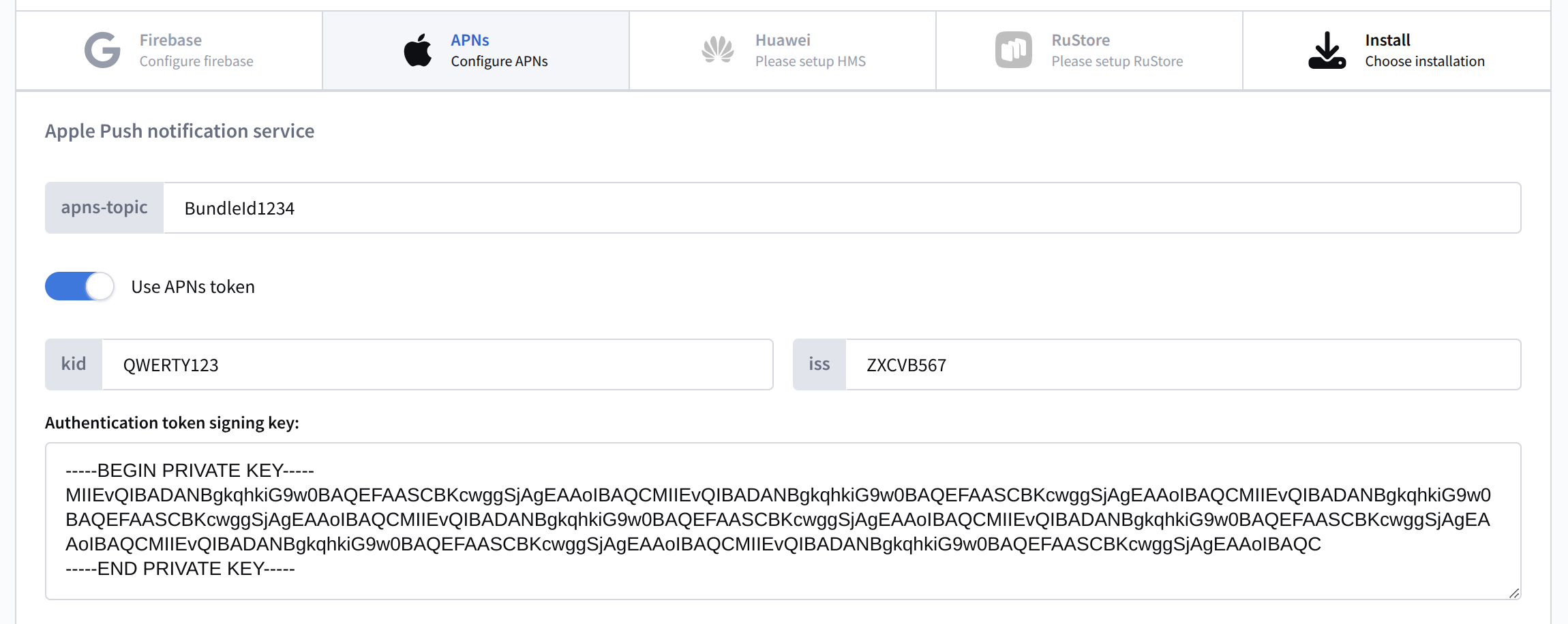 Enable Use APNs token and fill in the following fields: