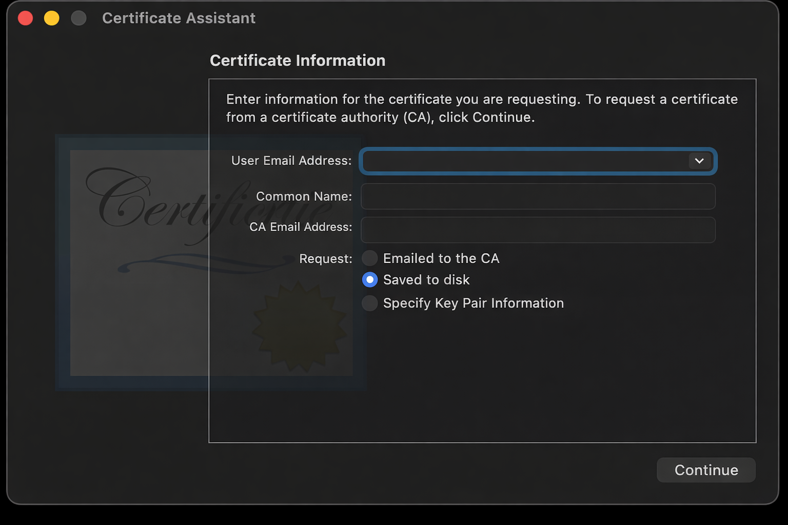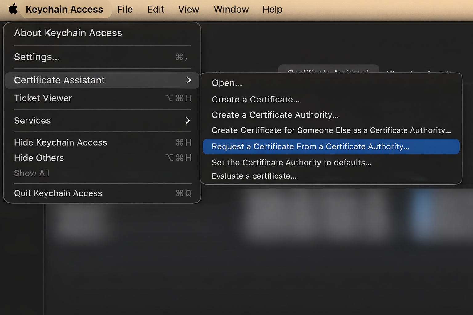 Request a certificate from the Keychain Access certificate authority: