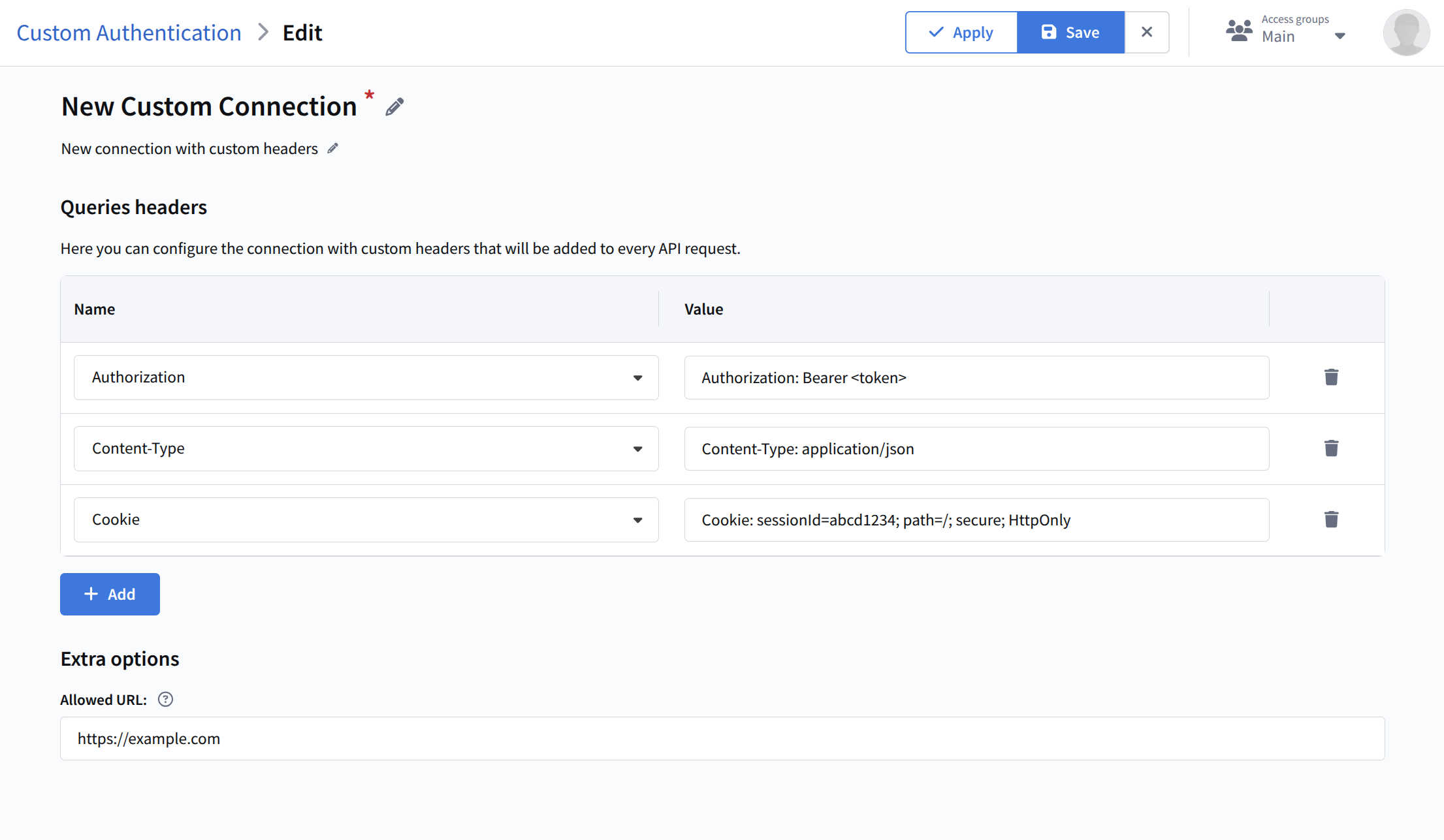 With this connection type, you can integrate the Altcraft platform with any external service that requires custom HTTP headers for authentication or other purposes, including API requests that use a key in the header.