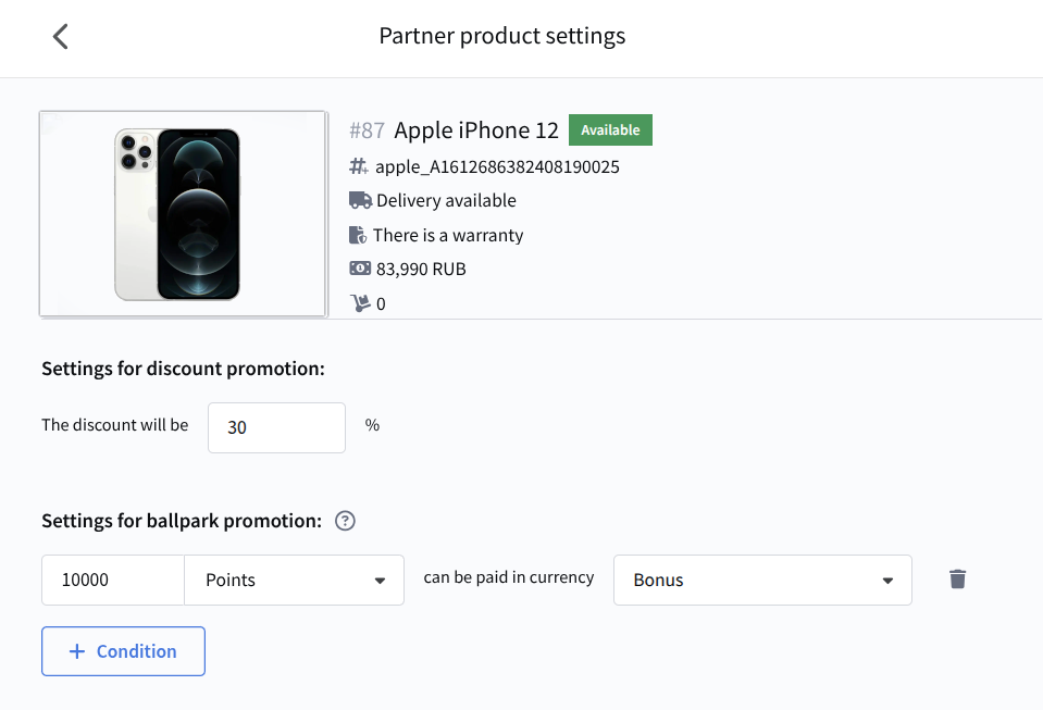 After configuring points and promotional campaigns, you can verify that everything works correctly using the promotion testing feature. You can perform a preliminary order calculation for both an existing profile in the database and a test participant with manually specified context: