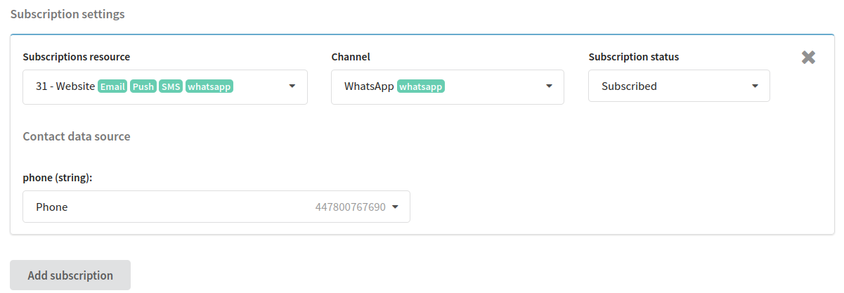 Next, import subscriber data into the platform, for example, via a file. When importing, add them a subscription to a resource with a WhatsApp* channel. Select the column in your file that contains phone numbers as the subscription source.