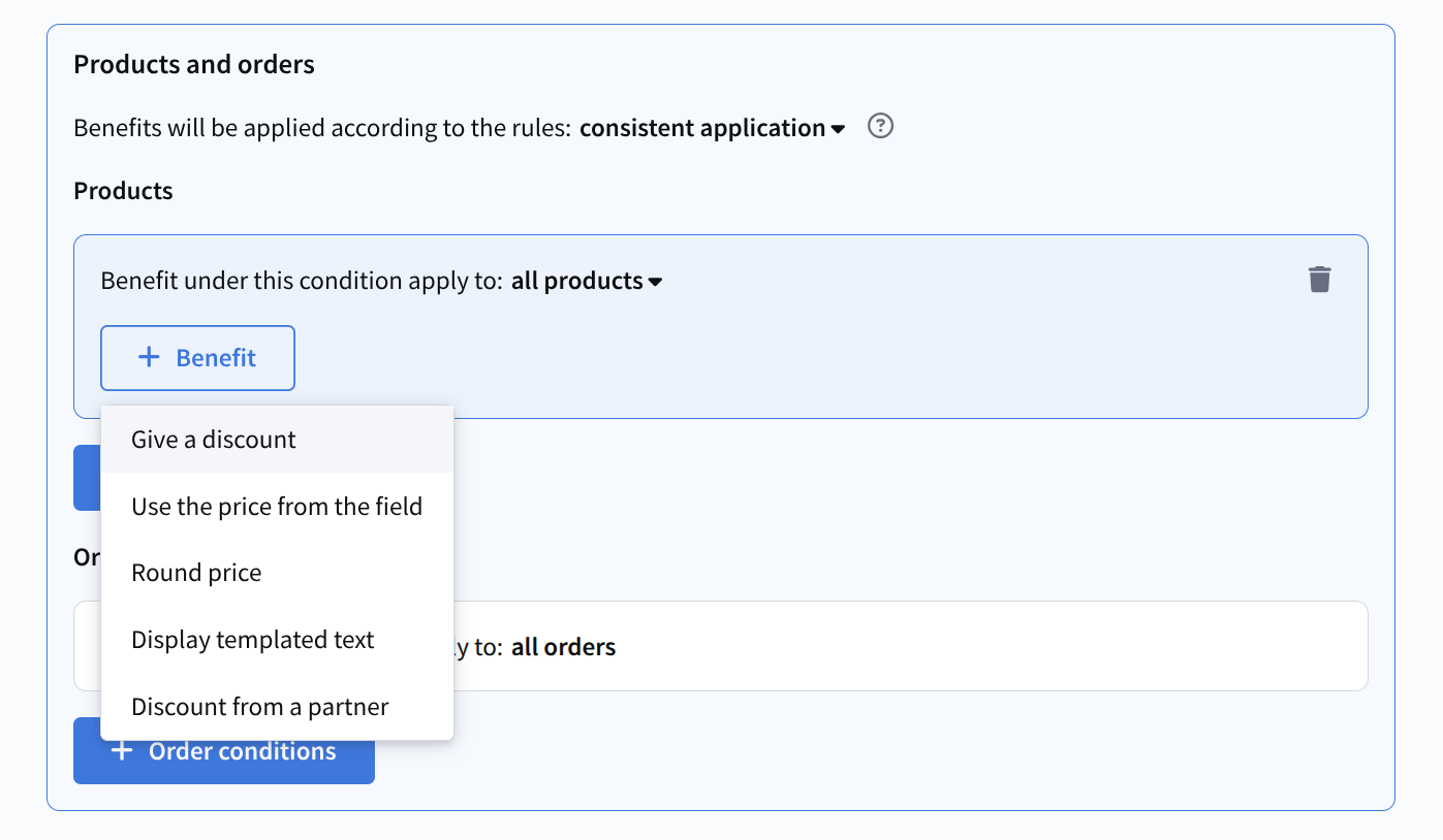 When adding partner products, you can also set application conditions depending on the type of promotion.