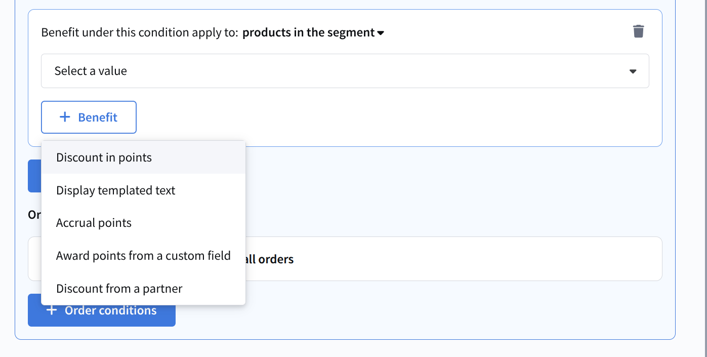 - Accrue points — credits specified loyalty points to the profile. You can configure when points are credited, for example at order creation or after delivery;