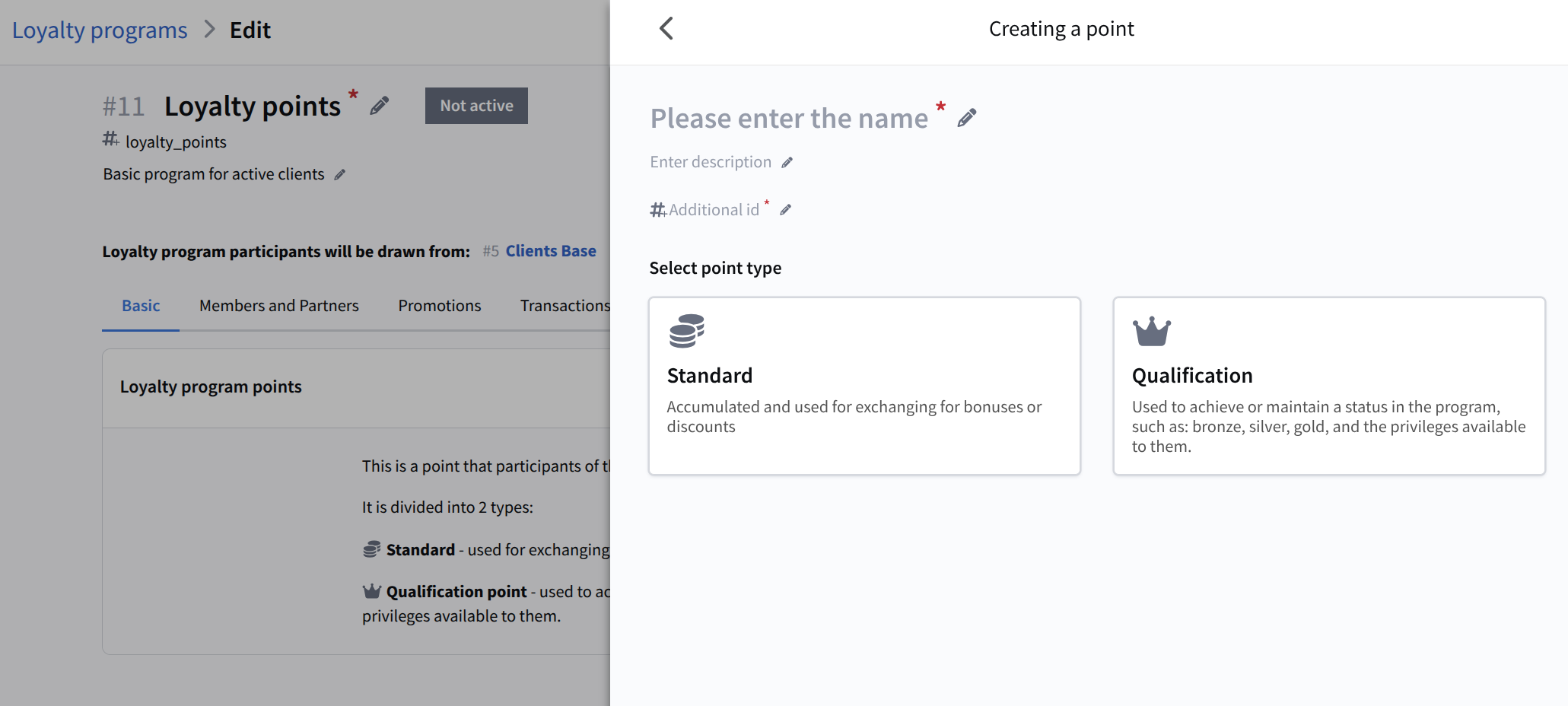 Loyalty program points — this block is used to create and manage points types within the loyalty program. Specify the points name and external identifier, and optionally add a description.