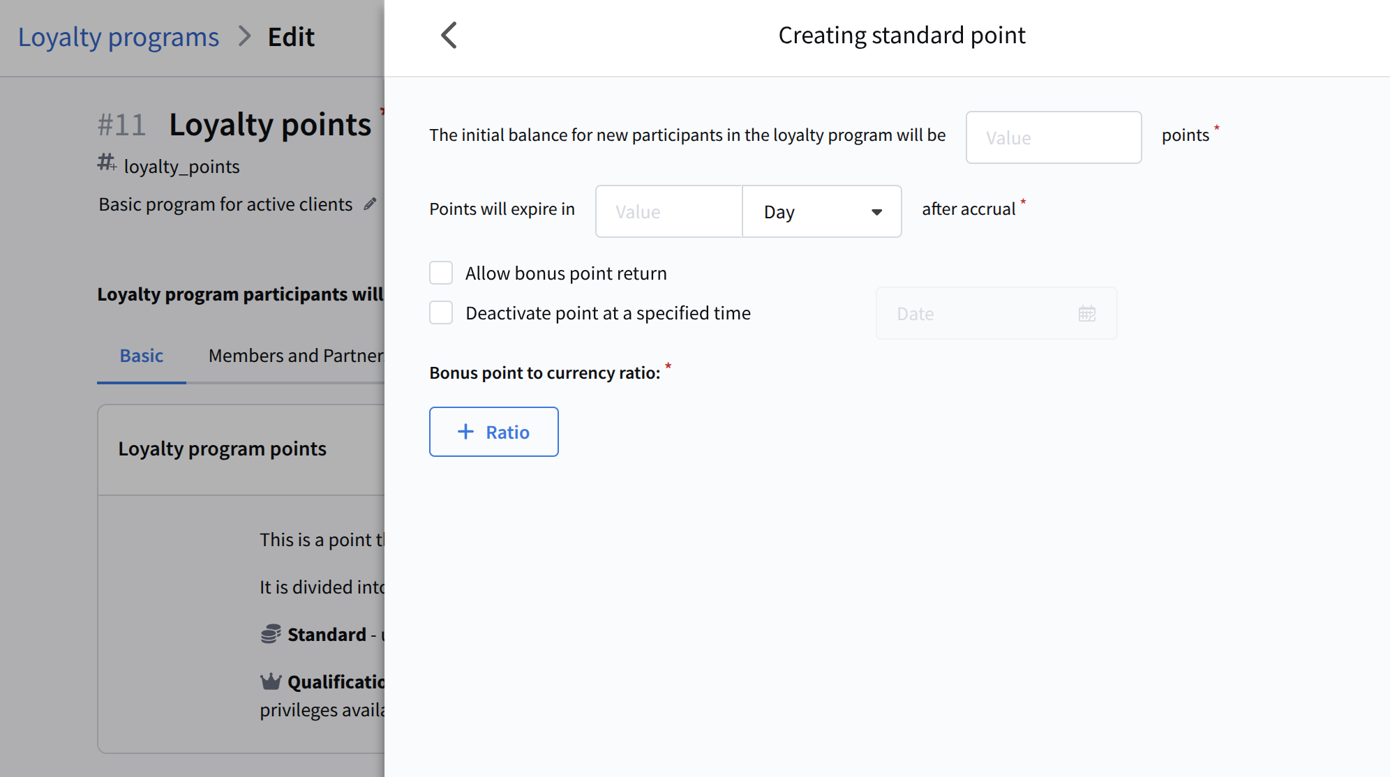 - Bonus-to-currency ratio — a required parameter defining how many bonus points correspond to a monetary amount, for example: 1 point = 1 USD or 10 points = 1 USD. Used for discount and redemption calculations.