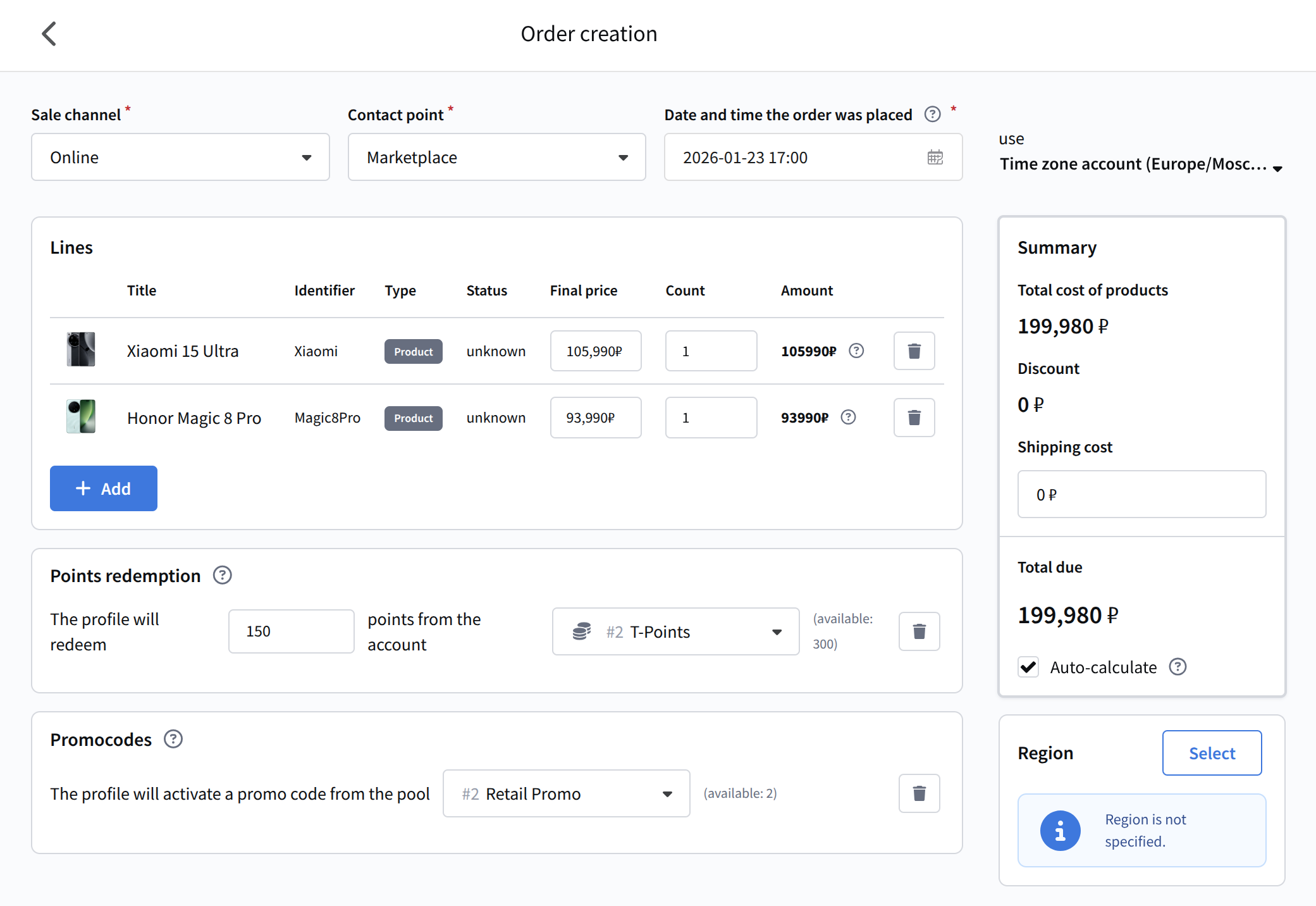 - Lines — products, quantity, and final price. After selecting a product, you can edit it. Changes apply only to the test order and do not alter Market data. This is useful for testing promotions on new prices;