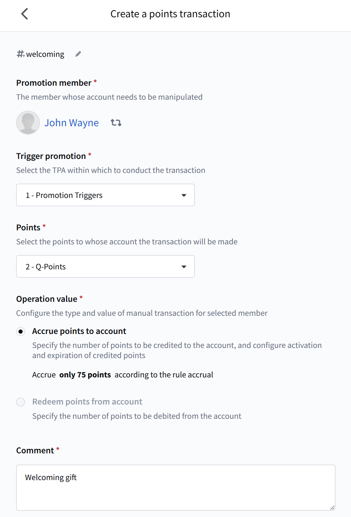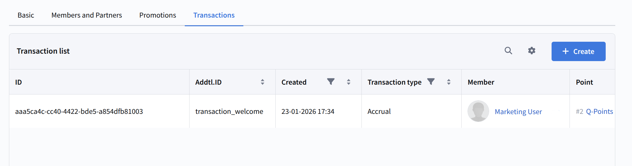 The Transactions section contains a list of all transactions within the loyalty program. Here you can also create a new transaction to accrue or redeem points.