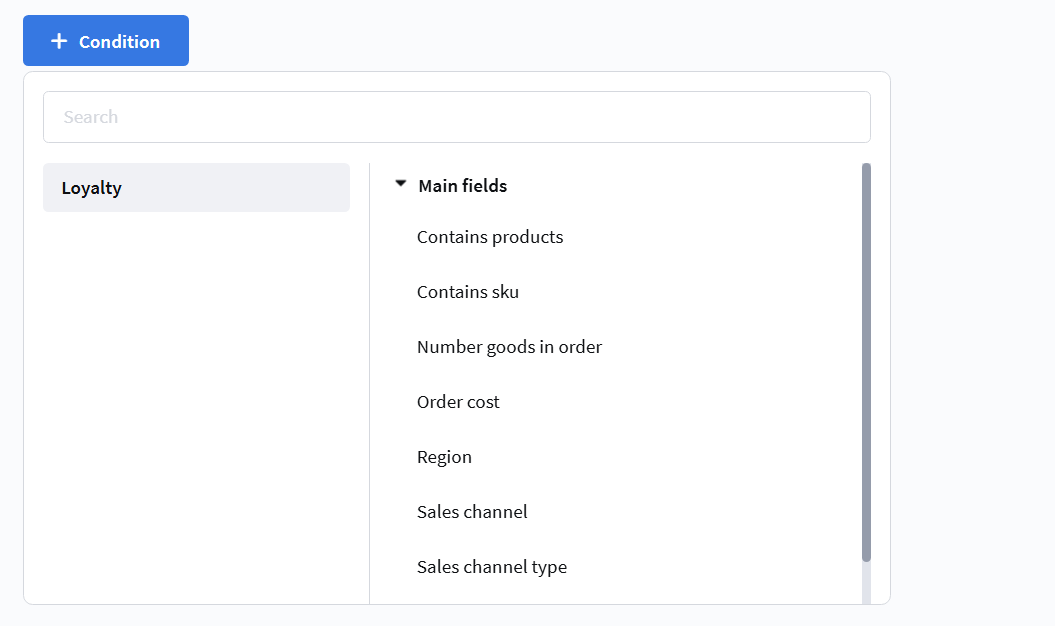 For example, a marketer wants to launch a promotion that gives a 10% discount only for orders placed through the online store. To do this, they create an order segment where in the Sales channels section they select the is in list operator, specify the Website sales channel and the Website cart contact point.