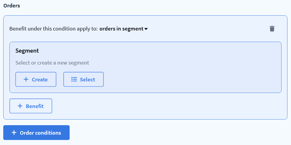 To use an order segment in a promotion, go to the Orders section during promotion setup and select orders in segment from the dropdown. Then click Select segment.