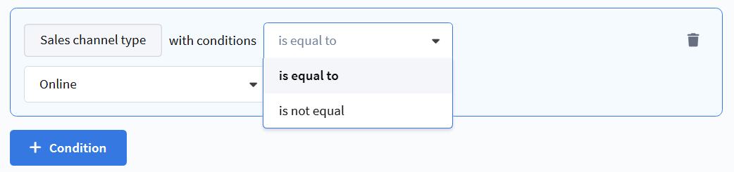 • is equal to — the sales channel type matches the selected value.