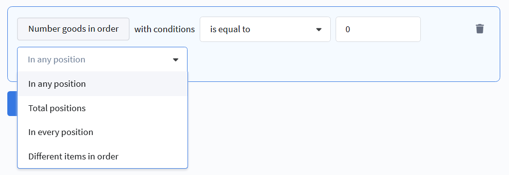 • In any position — checks if there is at least one line item with the specified quantity.