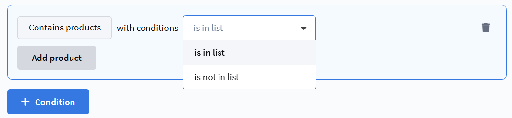 • is in list — benefits are applied if the order contains products that are included in the selected list;