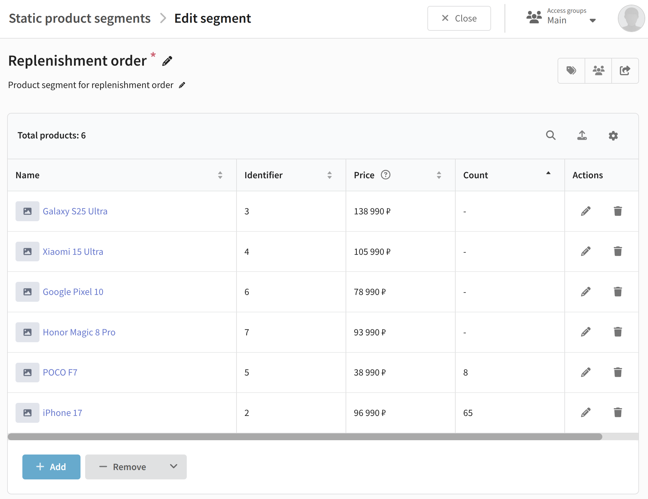 After clicking "Add", products matching the selection rules appear in the segment. To remove products from the segment, click "Remove". The removal function works the same way as adding products.