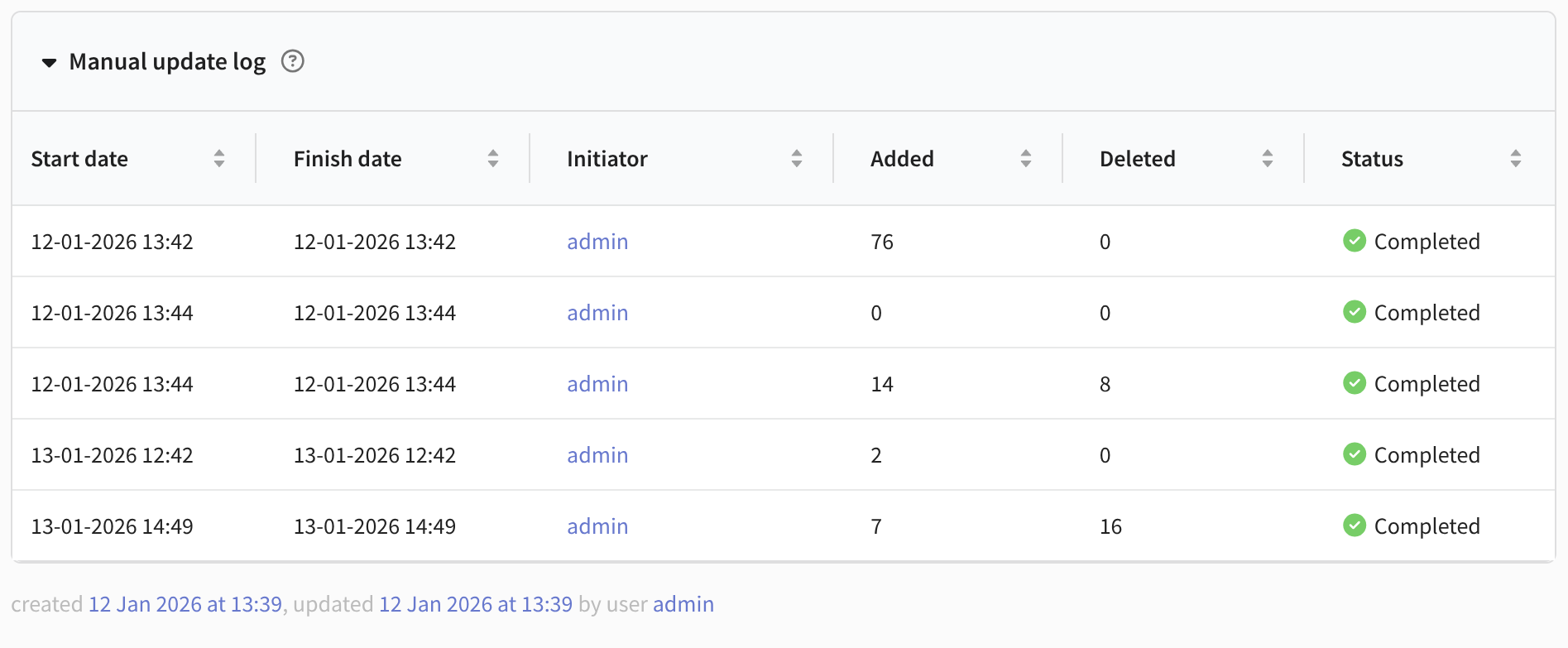 Below the update history is the "Manual changes log". It contains a detailed record of all operations that affected the segment composition. For each operation, the following is shown: