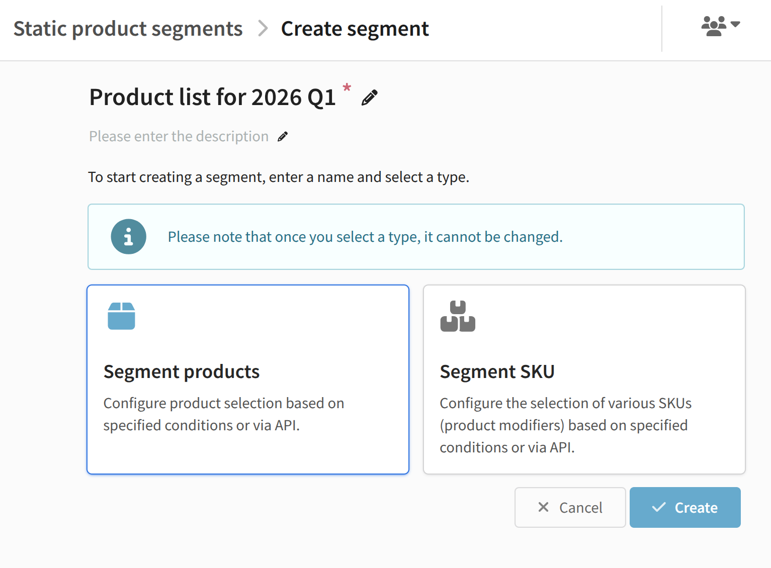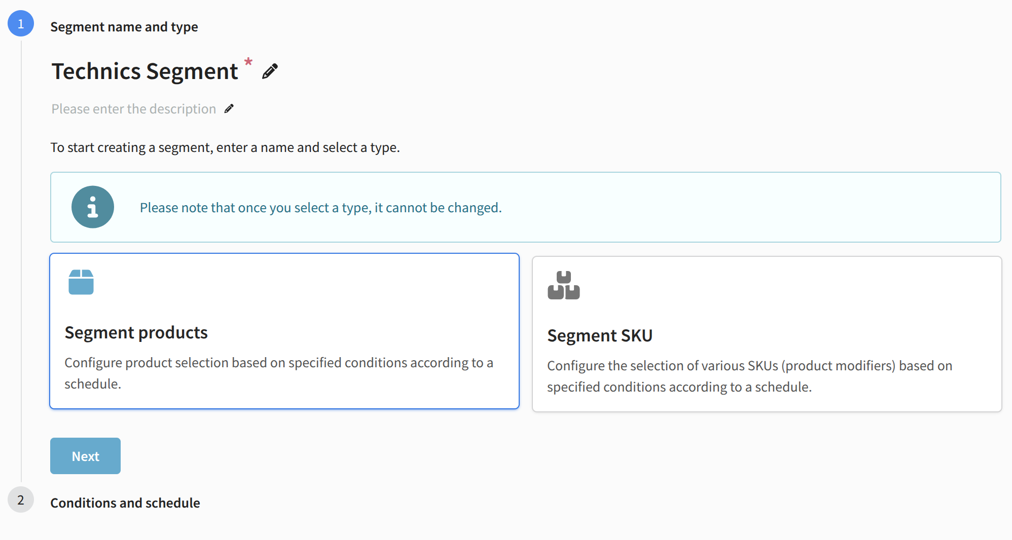 Click "Create". Specify a name, description, and select entities for segmentation — products or SKU. After selection, the segment type cannot be changed: