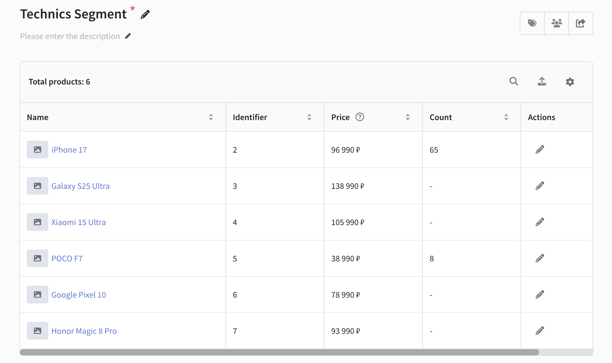 After calculation, the static segment view displays a table with all products included in the segment. It shows the fields "Name", "Identifier", "Price", "Quantity", as well as a quick actions menu for removal or opening product editing: