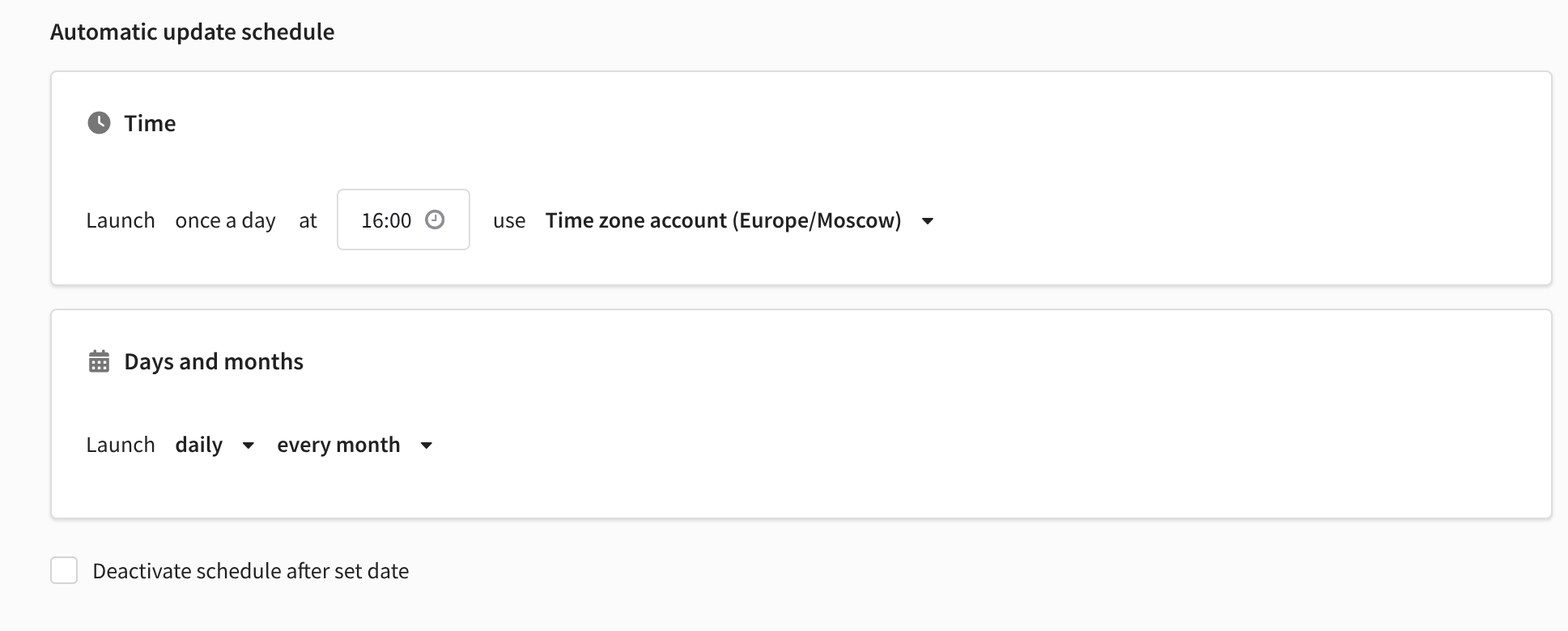 A segment can be updated daily or on specific days. Update time and time zone are set by the user: