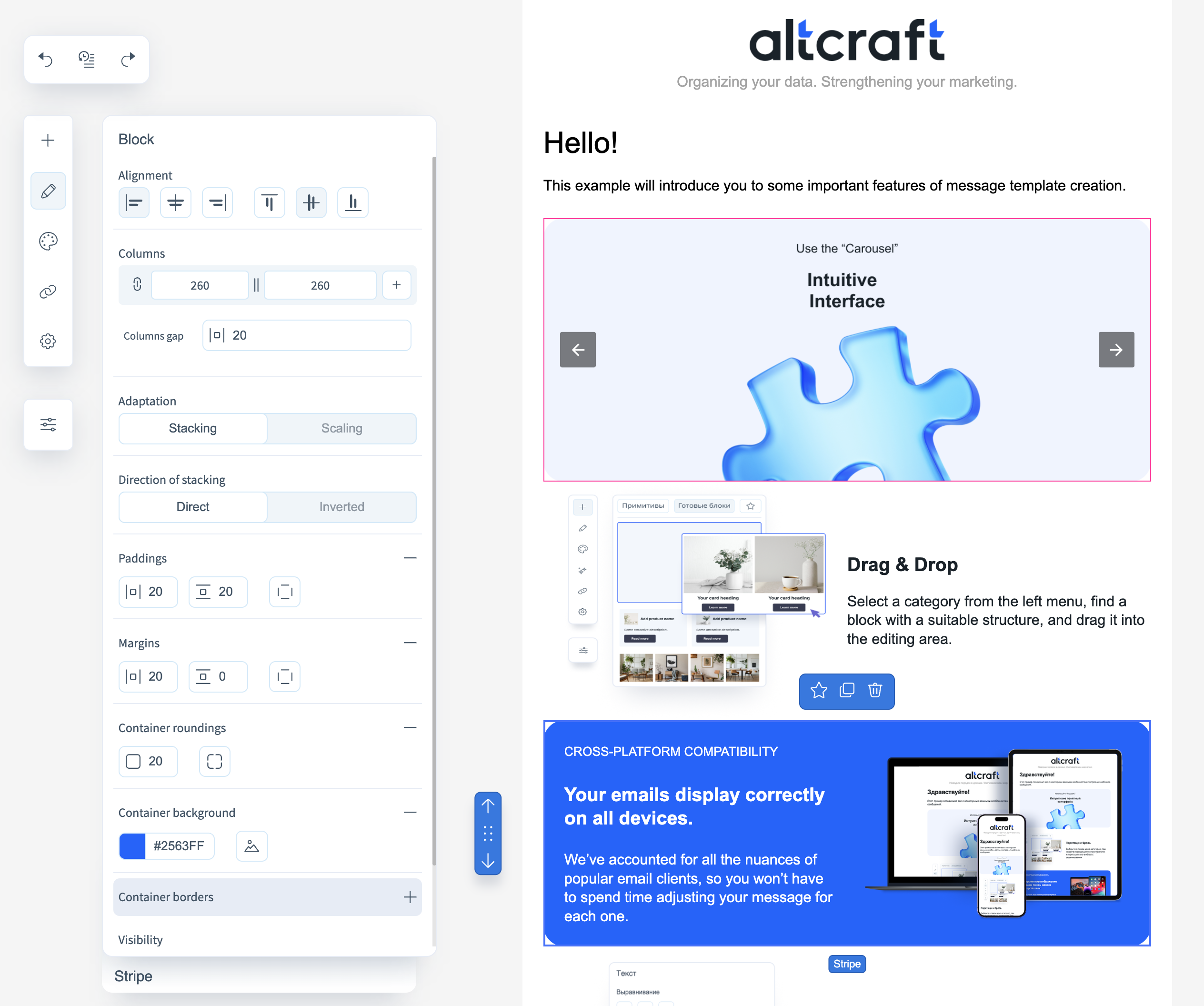 - Alignment — alignment of the block to the left, right, or center of the email;