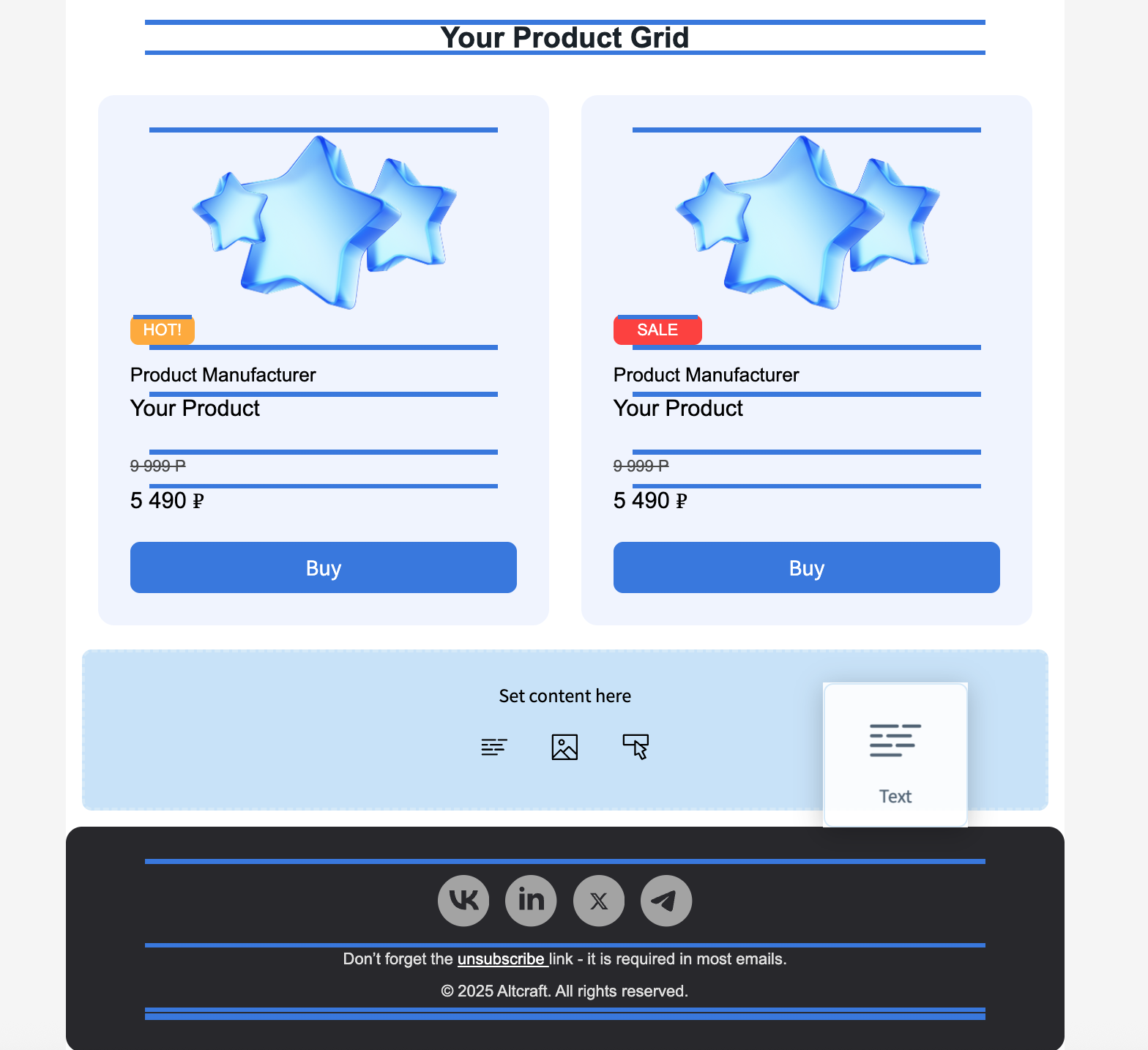 A collection of pre-designed blocks for various purposes. Using them, you can assemble a basic email layout in just a minute.