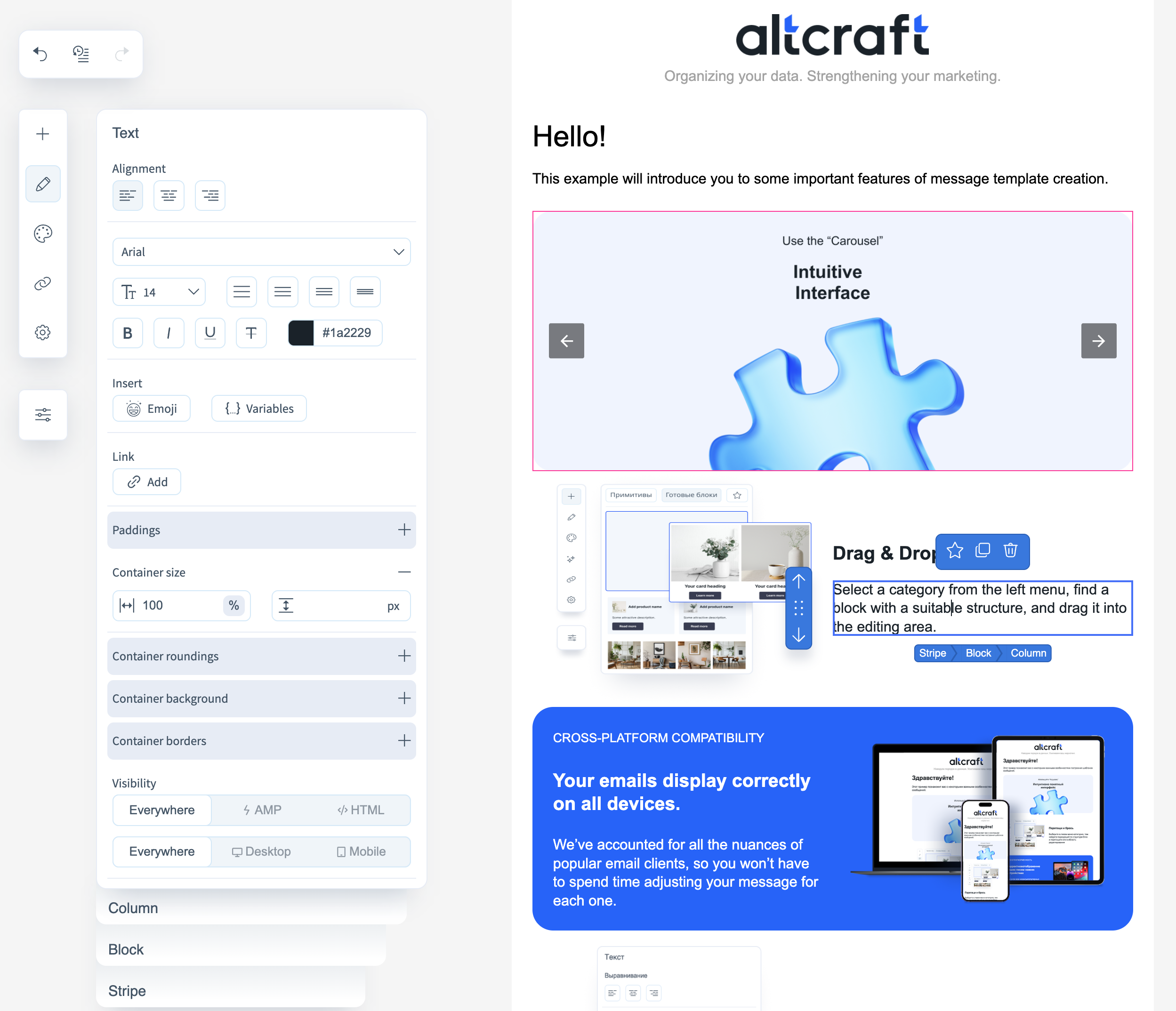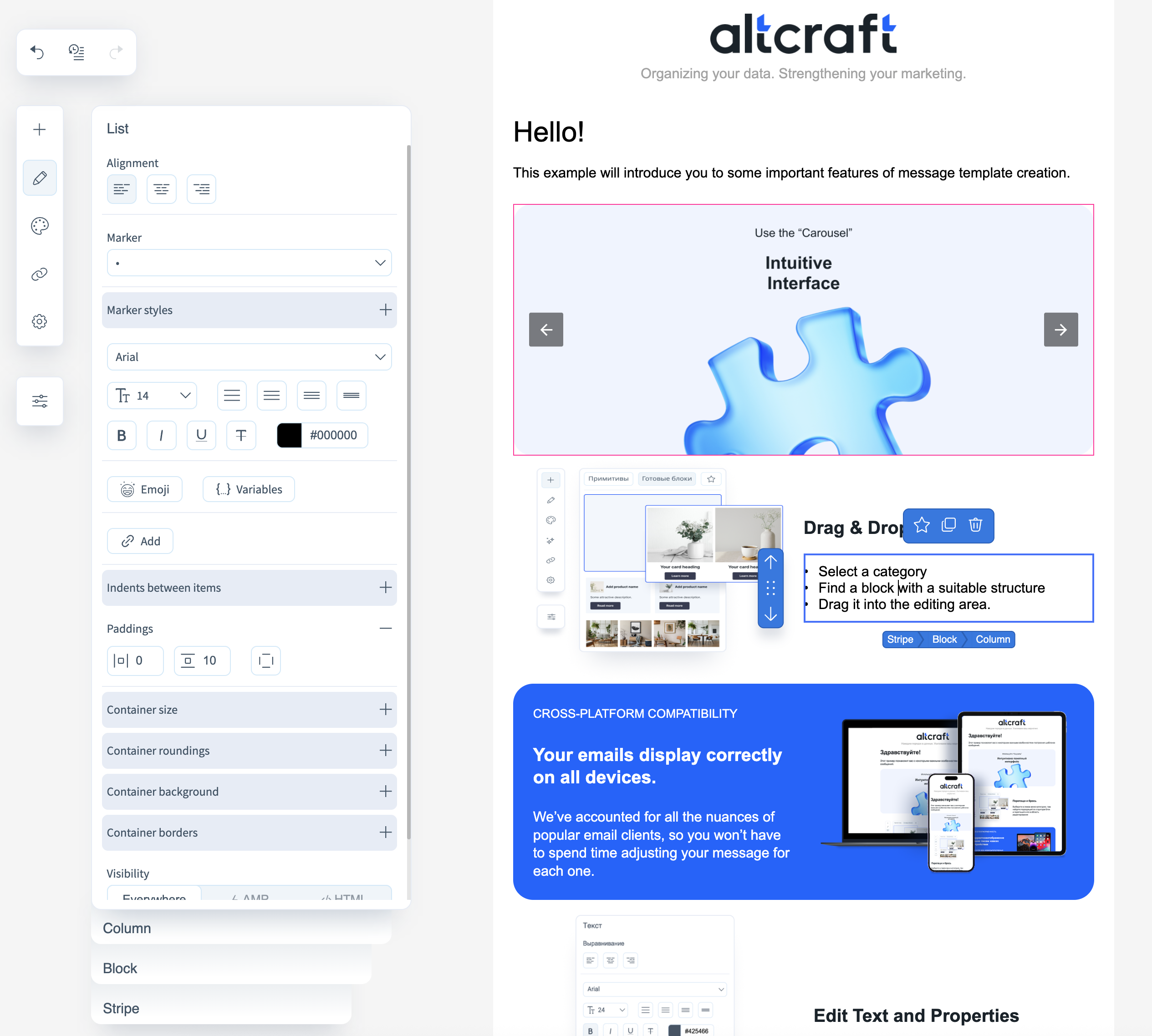 - Text properties — size, color, font, style, and insertion of variables and emojis. Links can also be inserted into the text;