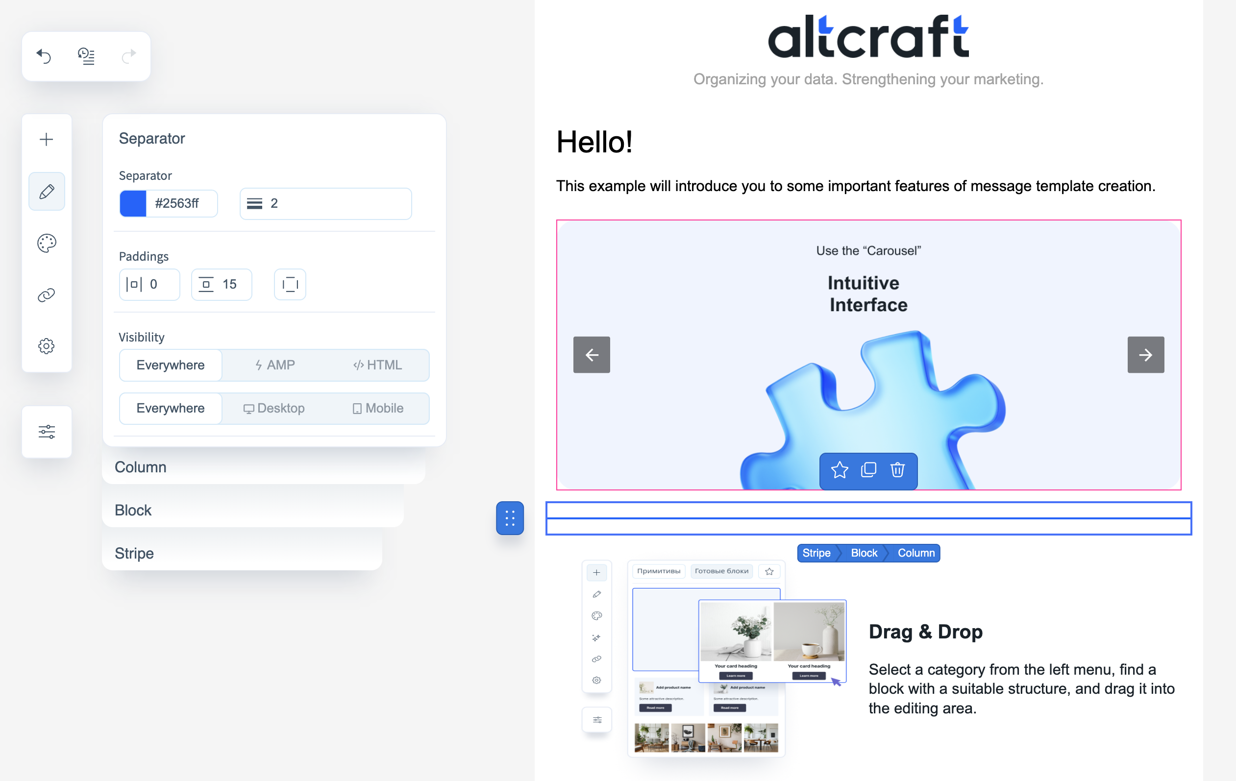 Block editor for email template is a tool for creating, editing and customizing marketing email templates and emails without writing code. It is designed for marketers and designers who want to quickly assemble professional emails with an easy-to-use interface using blocks, visual elements and design customizations.