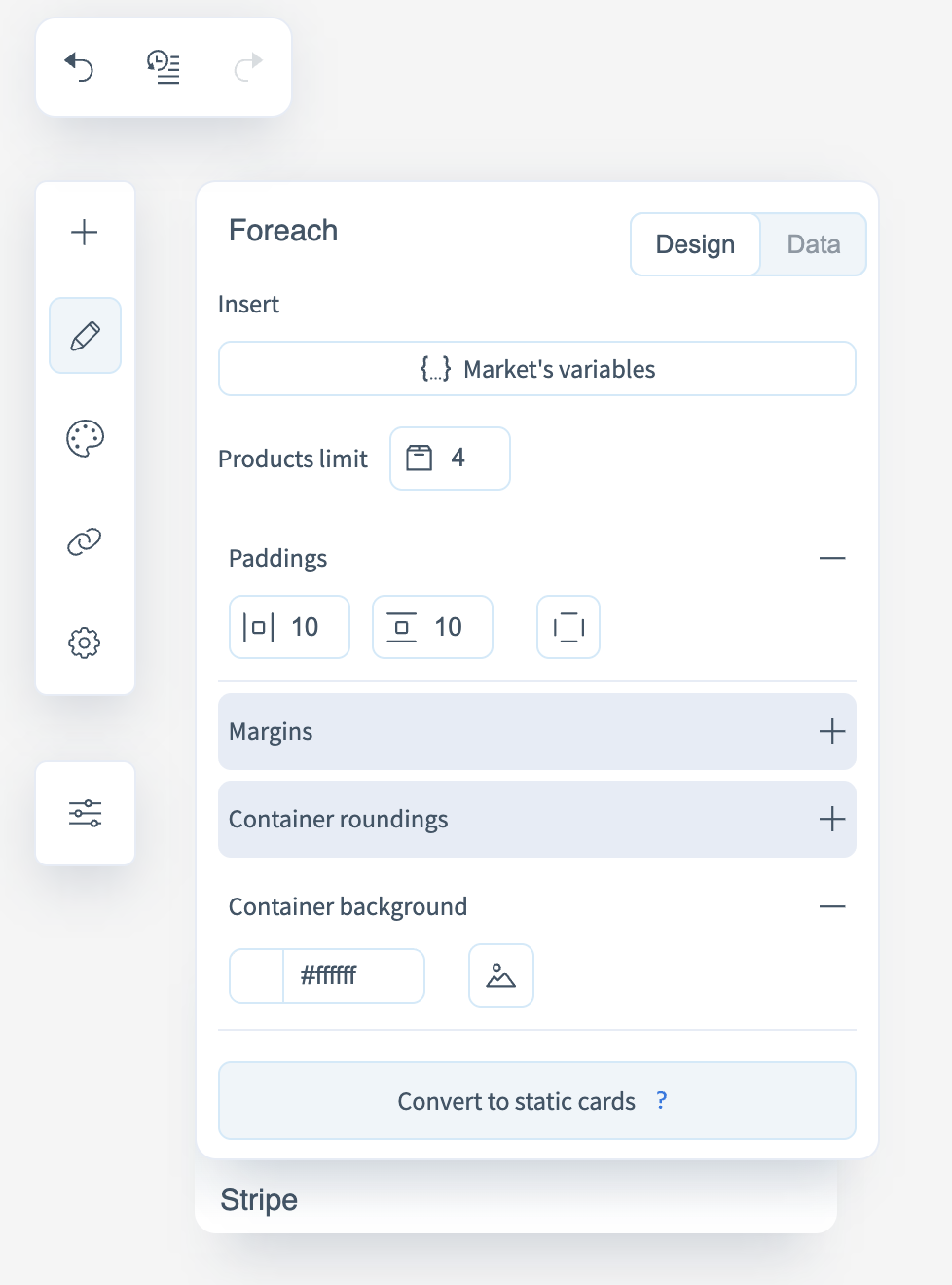 - Market variables — define which elements are displayed in the card: name, price, image, button, etc.