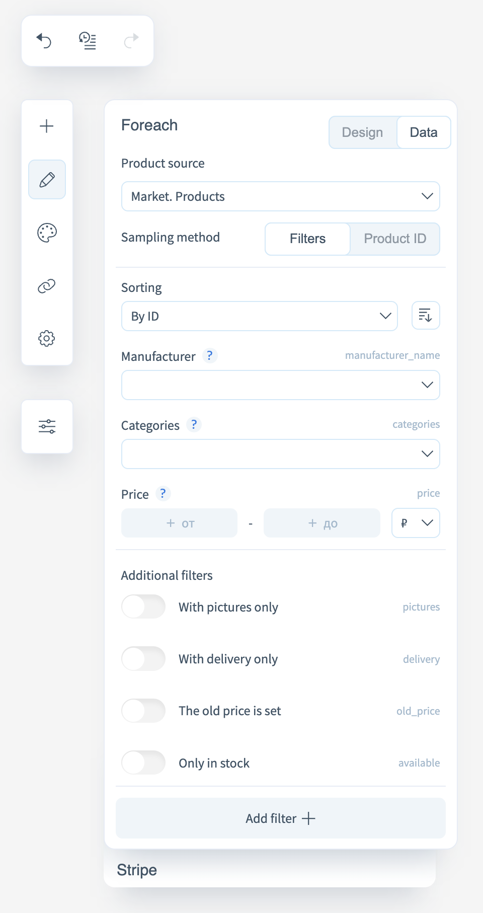 - Filters — dynamic product selection mode based on defined criteria (sorting, manufacturer, categories, price). Additional filters are available: only with images, only with delivery, has old price, in stock only.